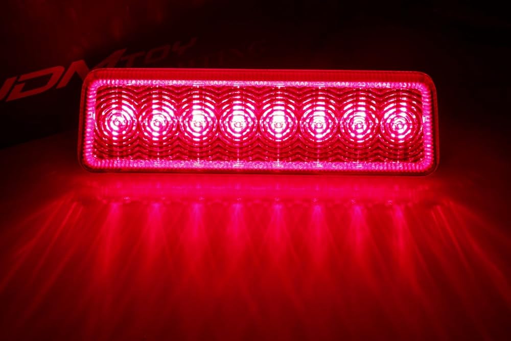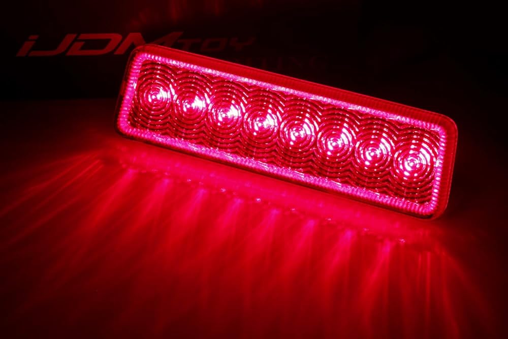 Complete kit includes a set of dark smoke lens base-less Formula-One style strobe flash enabled 8-LED 3rd brake lamp with the compatible behind the spare tire mount metal bracket