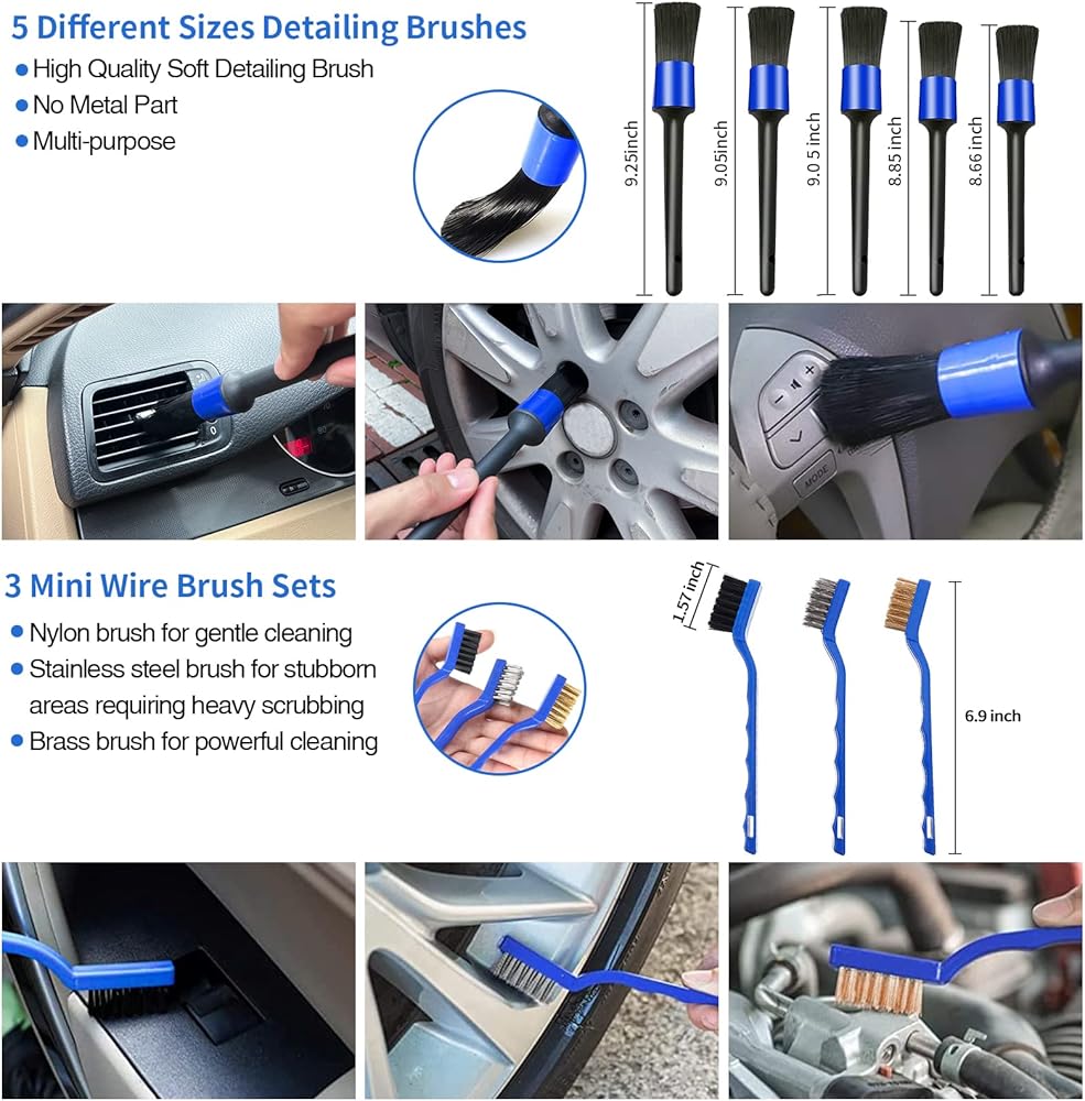 Car Detailing Brush - 1 nylon bristles tire brush, 5 different sizes car detailing brushes and 3 wire brushes, meet any cleaning needs of small cracks, corners, lug nuts, wheels, vents, car seats, engine compartments, dashboards, signs, etc.