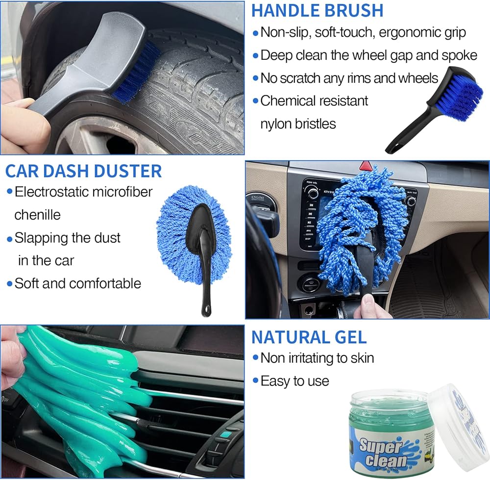 Automotive Microfiber Cleaning Tools, Wash Sponge and Cleaning Gel - 1 air vent brush, 2 microfiber towels, 1 double-sized microfiber wash mitt, 1 microfiber dashboard duster brush, 1 Grouting wash sponge and 1 car cleaning gel, make no room for small dirt and lint even the areas out of sight.