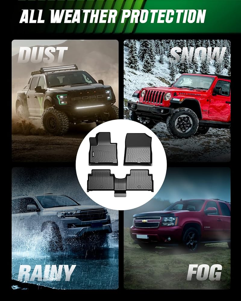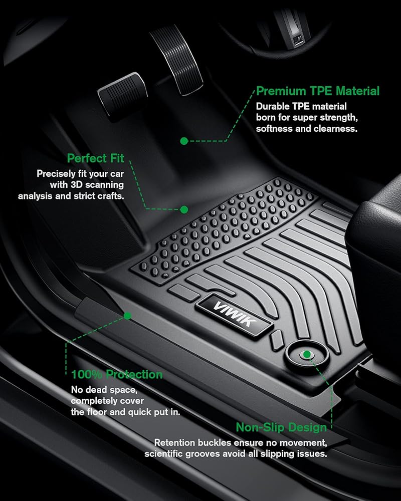 PREMIUM TPE MATERIAL --- These floor liners are made from 100% TPE material, which is environmental-friendly, completely odorless, and durable. So you won't have to worry about any unpleasant smells when you put them in your car. They are naturally comfortable, easy to clean, and long-lasting. You won't have to worry about them becoming deformed, stiff, or breaking.