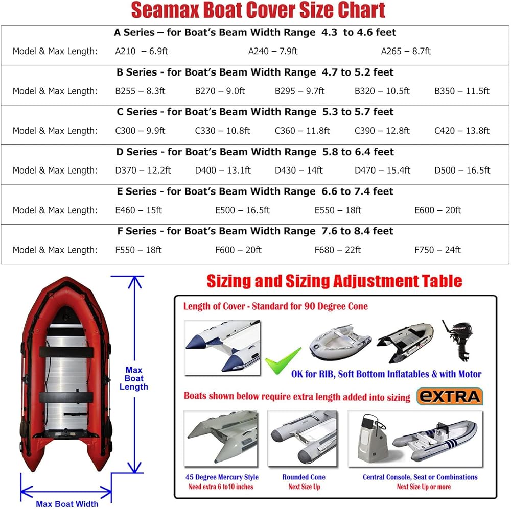 FULL SUPPORT - Seamax inflatable boat covers have 6 series and overall 25 models. Our boat covers can fit the inflatable boats from 6.5ft to 20ft. Each series includes couple of sizes for different tube styles & boat length. Our boat cover sizes under a same series should be with the same width. The bow style will not affect the cover size in most cases.