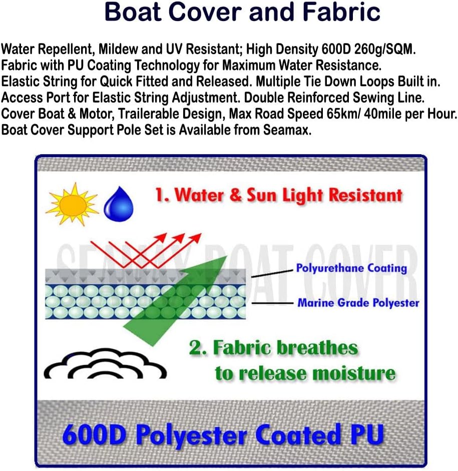 MOTOR WELL STYLE & TRAILERABLE - Our boat cover should be able to cover your boat and the motor. Fabric Specs - Water and UV resistant; Density 600D/260g/SQM. Elastic string design for quick fitted and released, Multiple Tie-Down Loops built-in, free cover carrying bag included. Max trailer Road Speed 65km / hour (40mile / hour), additional tie-down core will be required.