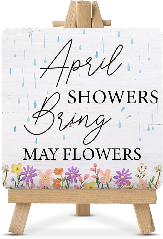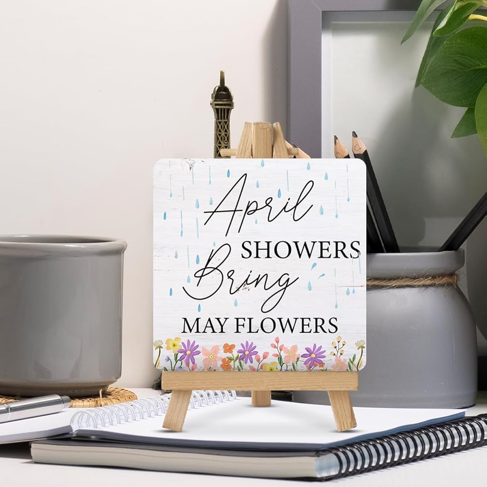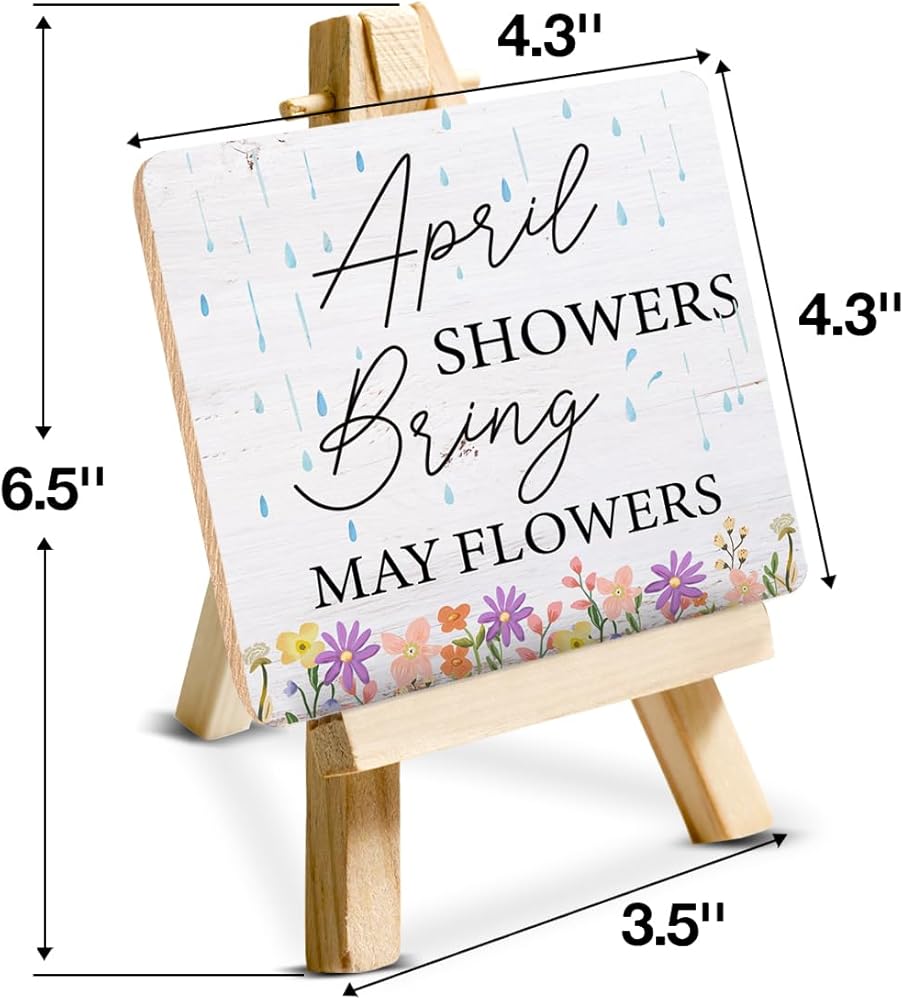 Farmhouse Spring Decorations April Showers Bring May Flowers Wood Sign with Easel Home Table Desk Spring Tiered Tray Décor
