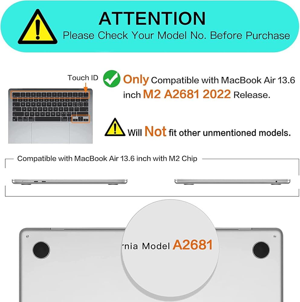 Applicable Model: Only compatible with MacBook Air 13.6 inch M2 Chip with Retina Display and Touch ID 2022 Release. Please kindly check the model number "Axxxx" on the back of the laptop before your purchase.