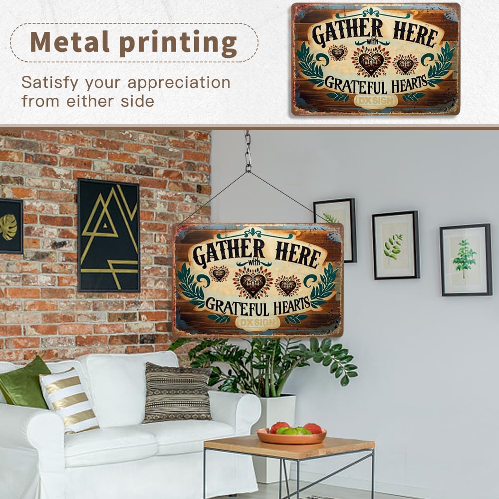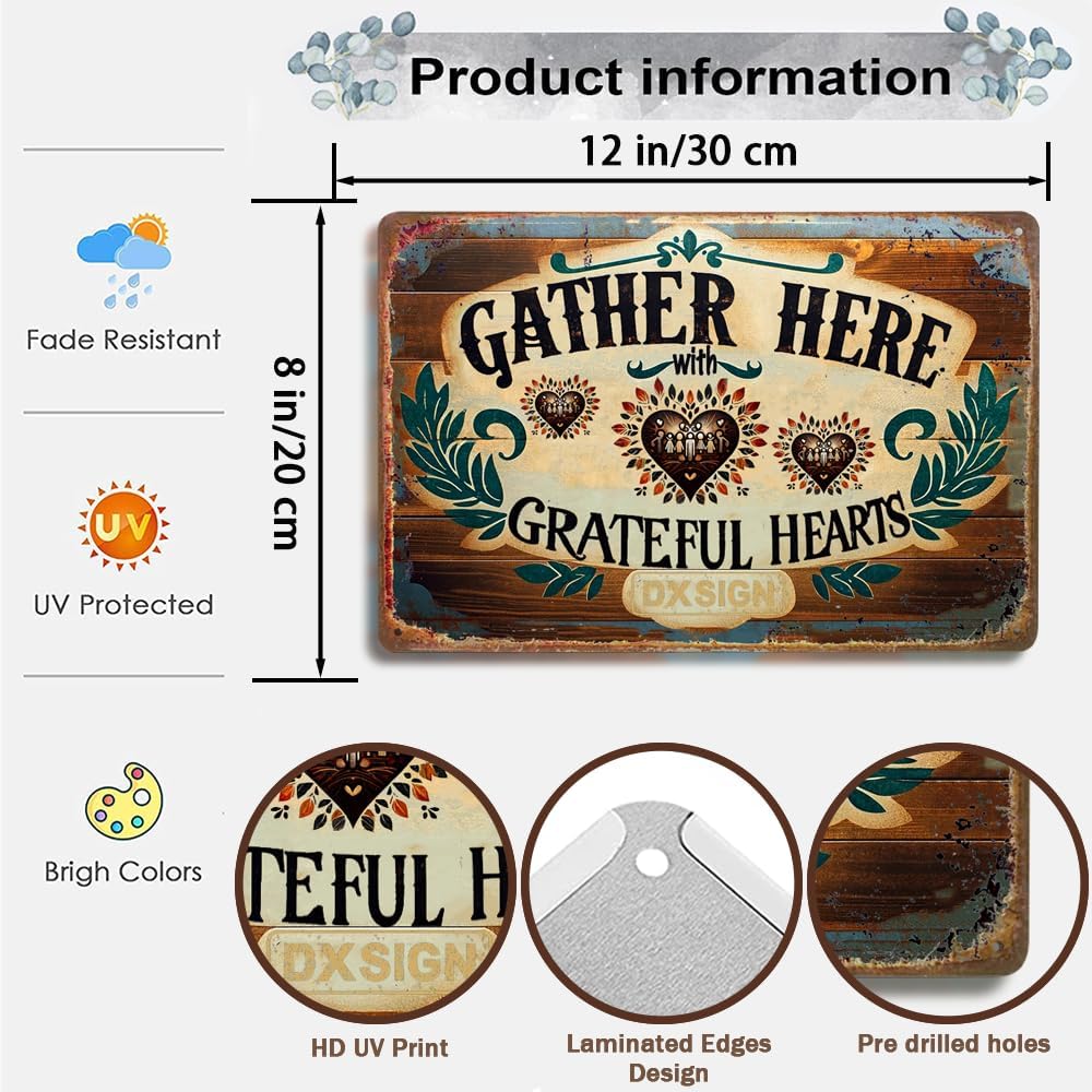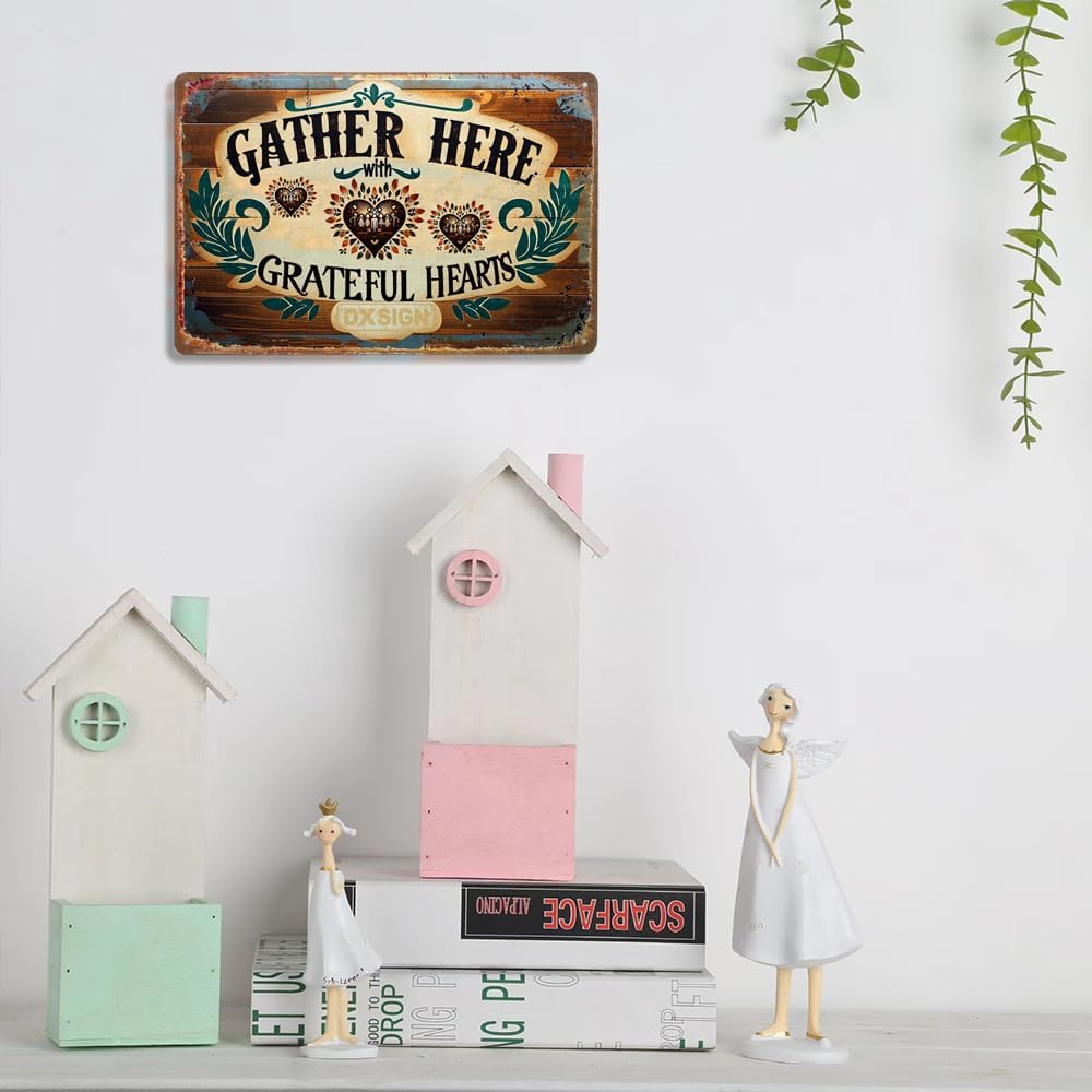 Vintage Metal Tin Sign - 'Gather Here with Grateful Hearts' - Rustic Wall Decor for Home, Kitchen, and Dining Room - 12x8 inches Distressed Retro Wall Art