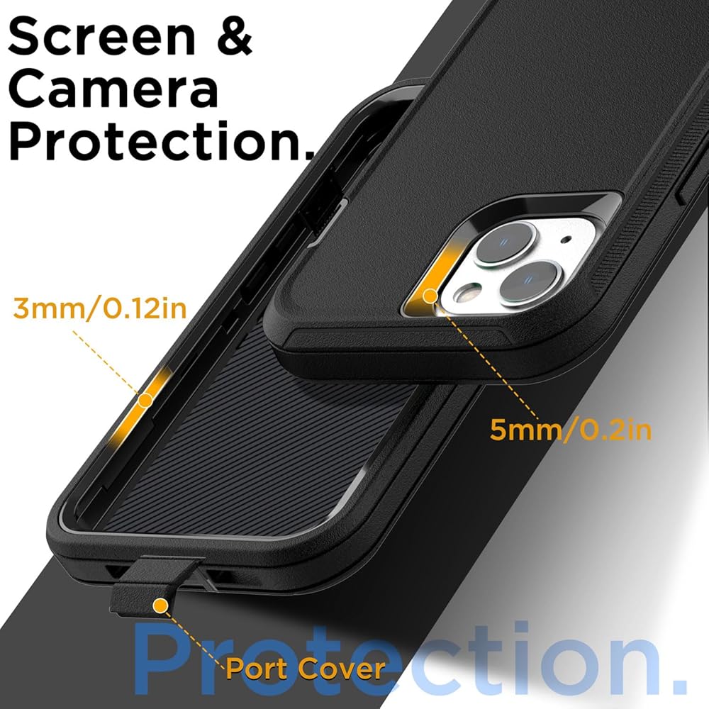 [SAVE THE BACK CAMERA AND SCREEN]: Nearly 5mm (2x higer than others)camera raised bezels and 5mm screen raised bezels prevent screen and camera against from scratches & frictions.Extremely extend the service life of your phone cameras.Raised edges protect camera and screen plus non-slip edge design for secure grip and dustproof port covers to keep out dirt, the rugged for iPhone 14 shockproof Belt Clip case made for any adventure.