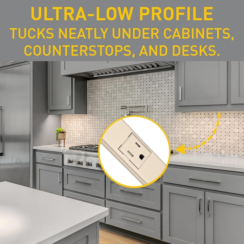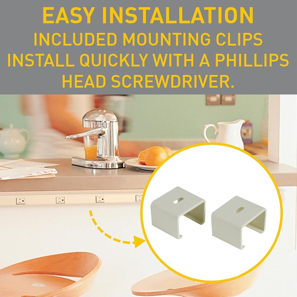 Easy to Install - This under counter power strip or kitchen power strip has a compact design and installs in tight locations, perfect for desks, under cabinets, or workshops, and includes mounting clips