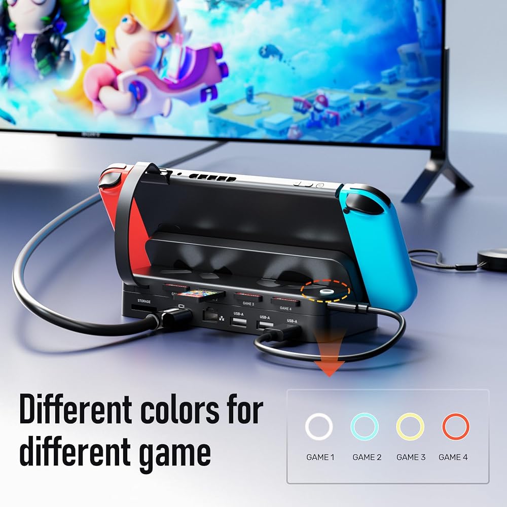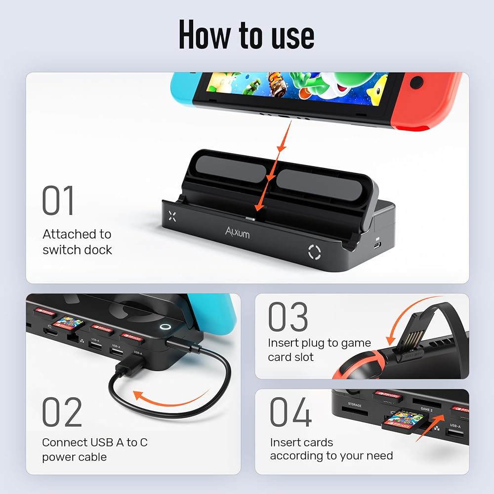 2 Modes Switching Games: Alxum Nintendo Switch multi-game card switcher can insert 4 cards simultaneously for reading, with one LED button changing 4 different colors to switch games quickly. Avoids inserting game cards frequently and repeatedly, ensuring a longer lifetime for game cards. Just plug and play, install the game switcher on the base, and connect them. Insert your favorite game cards and enjoy your pleasant gaming time! If You're Lazy, You'll Love This Nintendo Switch Accessory.