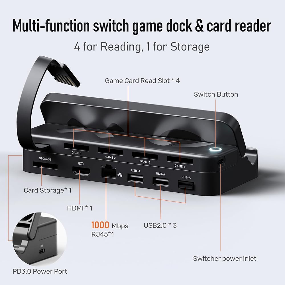 Alxum Nintendo Switch Game Card Reader with Remote Control - HDMI 4K30HZ Switch TV Docking Station Equipped with Gigabit Ethernet USB2.0 HUB*3 PD 3.0 Type C Charging, Portable Switch Game Switcher Set
