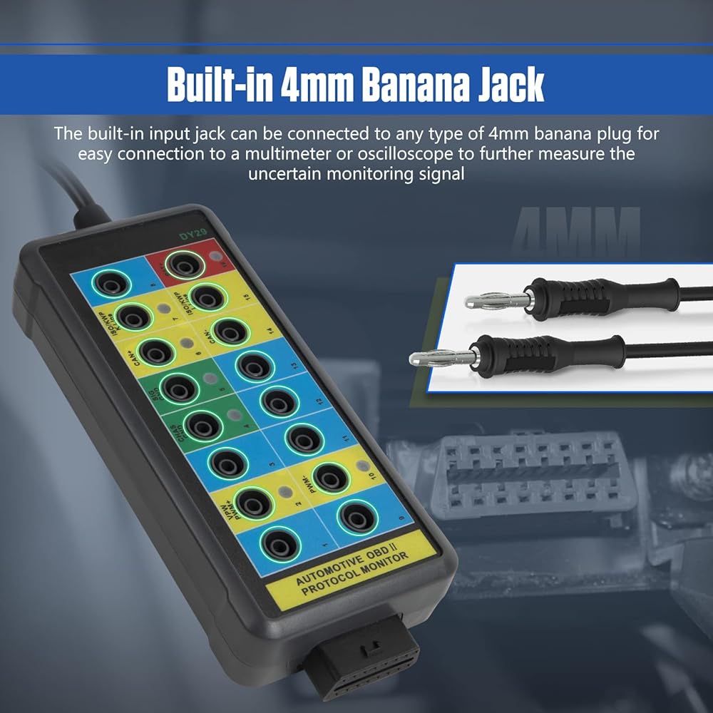 【تصميم 16 دبابيس وقابس موزة 4 مم لصندوق الاختراق obd2 】يحاكي تخطيط مقبس الإدخال لكاشف بروتوكول obd2 تمامًا تخطيط 16 دبوسًا لواجهة obdii، مما يسمح بإجراء المزيد من الاختبارات بسرعة وبشكل حدسي. عندما يتصل الماسح الضوئي obd2 بالمركبات، يمكن توصيل جميع دبابيس صندوق الاختراق obdii البالغ عددها 16 سنًا بسهولة. لا حاجة لتشغيل دبابيس واجهة OBDII مباشرة. يمكن توصيل مقبس الإدخال المدمج في كاشف بروتوكول OBDII بأي نوع من قابس الموز مقاس 4 مم. يمكنك توصيل مقياس متعدد أو راسم الذبذبات بمقبس الموز لاكتشاف معلومات الإشارة التفصيلية للمنفذ المضاء المقابل.