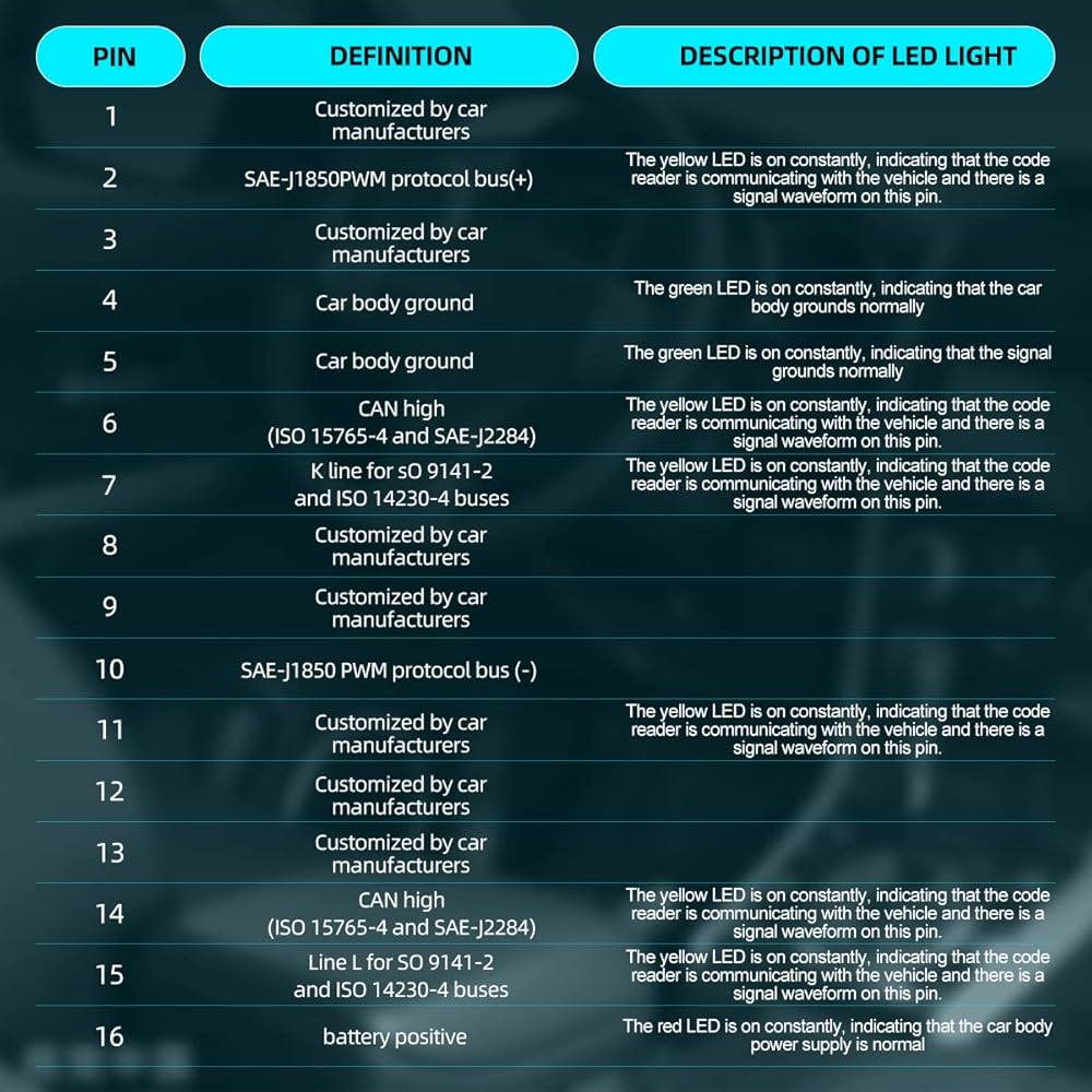 【تشخيص سريع لإشارة الاتصال وإمدادات الطاقة والكشف عن التأريض 】من خلال تحديد مؤشرات LED الملونة المختلفة لصندوق الاختراق obdii، يمكنك تحديد بسرعة ما إذا كانت واجهة obdii الخاصة بالمركبة تتواصل وتعمل وتؤرض بشكل صحيح. تشير مؤشرات LED الصفراء إلى أن الماسح الضوئي OBD2 يتواصل مع السيارة ويوجد شكل موجة إشارة على المسامير المقابلة 2/6/7/10/14/15. عندما يتم تأريض السيارة بشكل صحيح، تضاء مؤشرات LED الخضراء على الأطراف 4 و5. يتم تشغيل مؤشرات LED الحمراء الموجودة على الدبوس 16 عندما تكون الطاقة طبيعية.