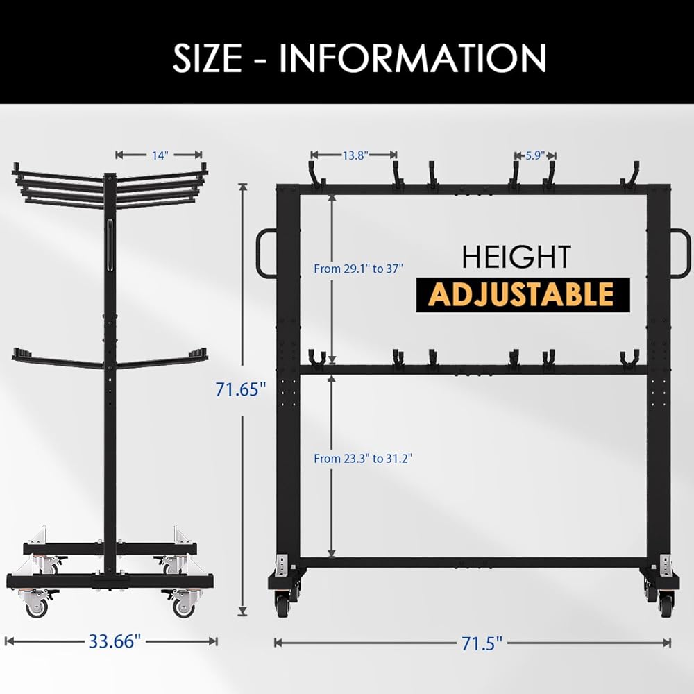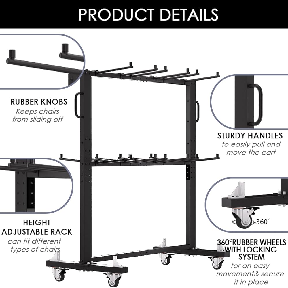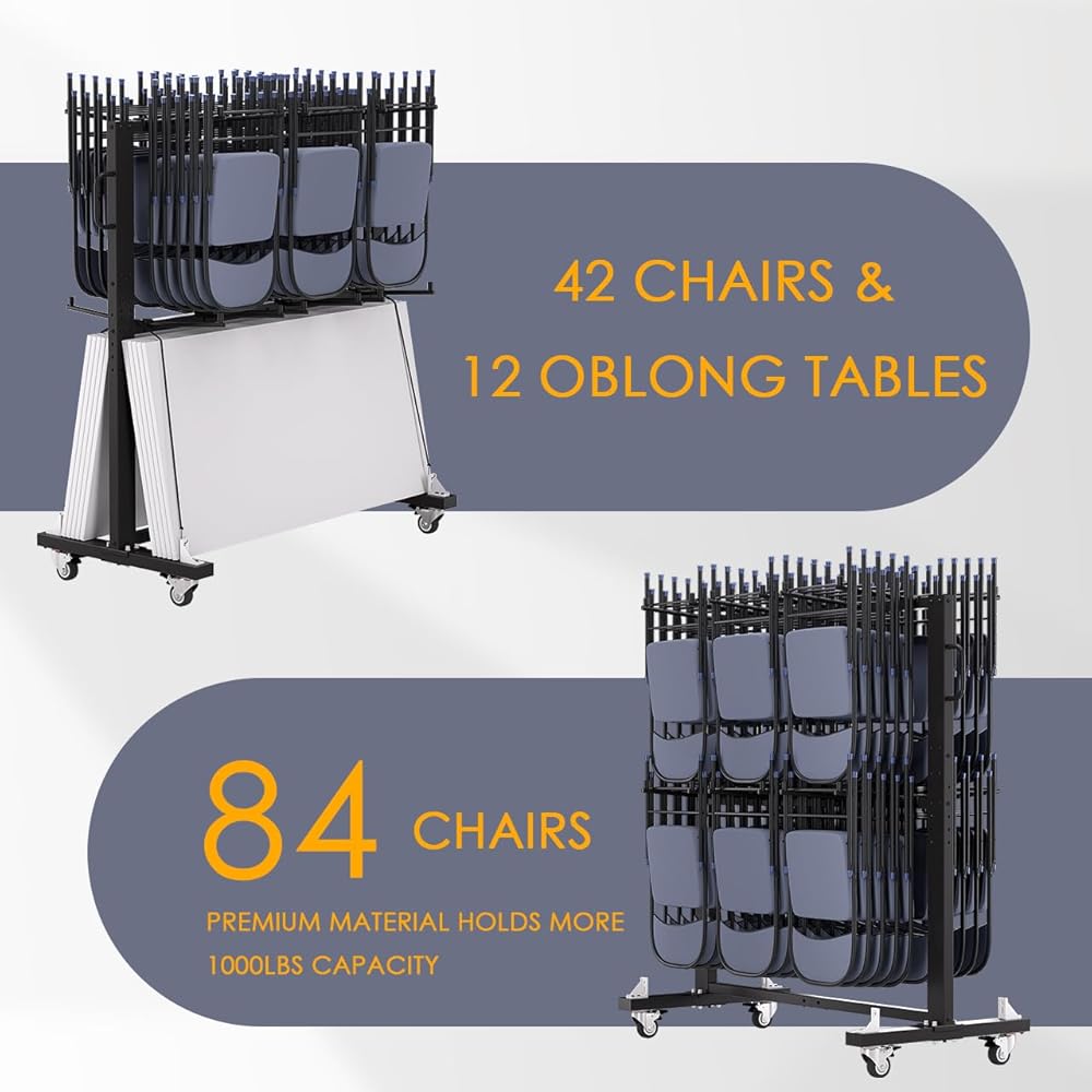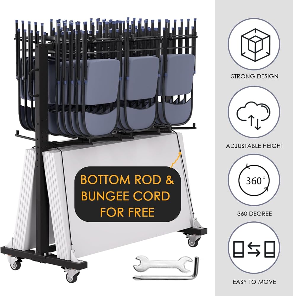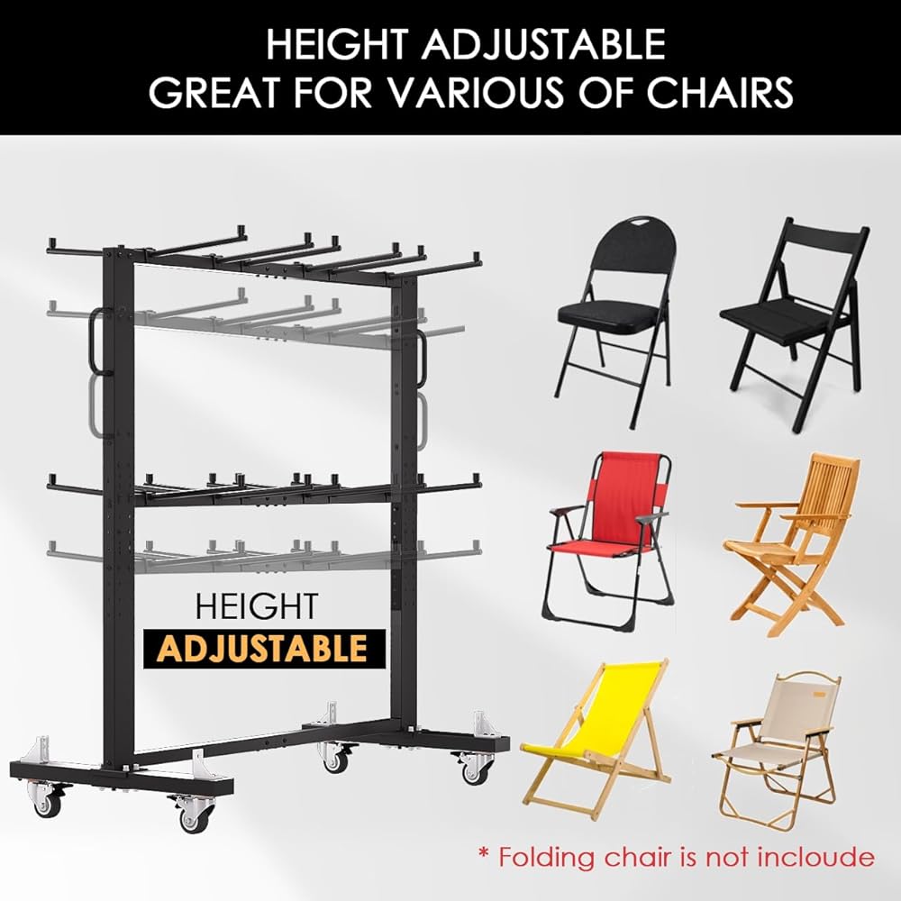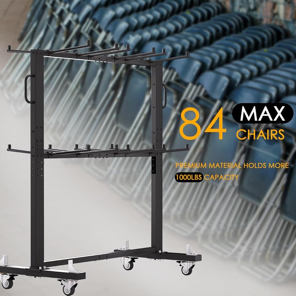 PREMIUM MATERIAL HOLDS MORE—Our two-tier folding chair cart features two racks for storing up to 84 folding metal chairs or 42 chairs and 12 tables. 1000 lbs weight capacity and 6 level height adjustment design for accommodate even more different sizes of chairs and tables.