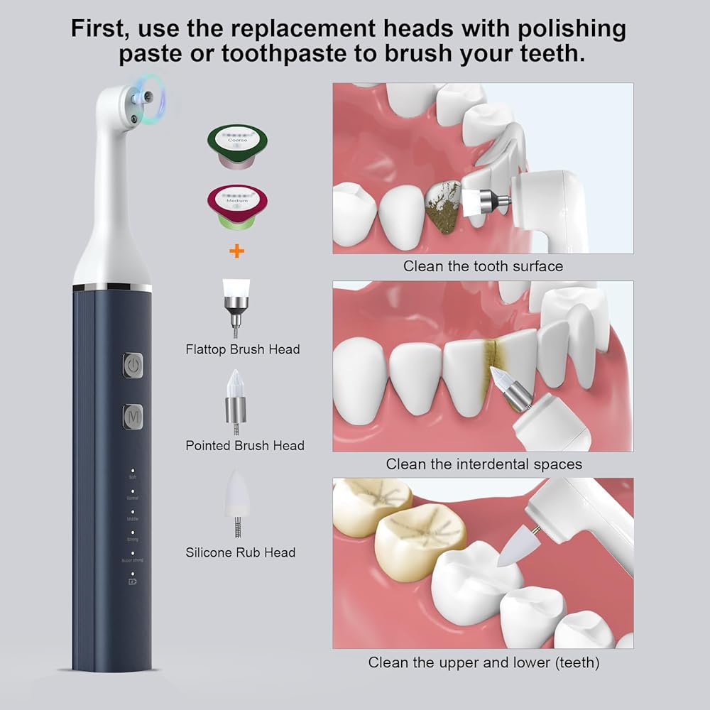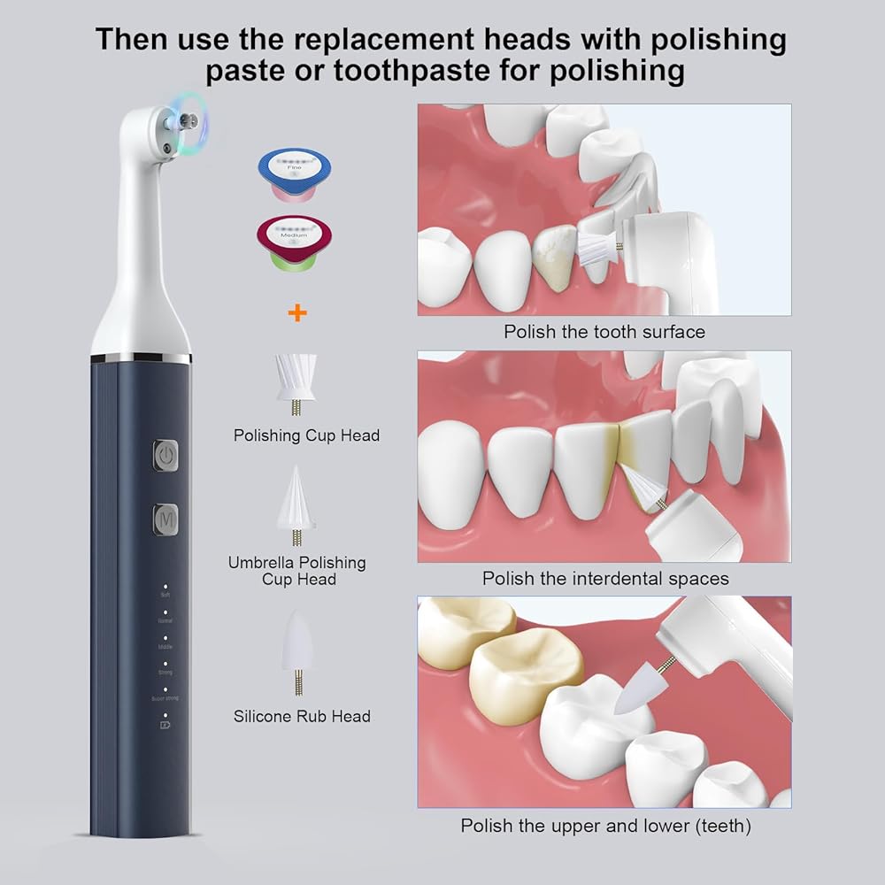 【Electric Tooth Polisher-How to use it?】The tooth polisher is equipped with 5 replaceable polishing heads und five gears; Choose the replacement head and gear for your needs. There are details in the main picture for polishing heads und modes.