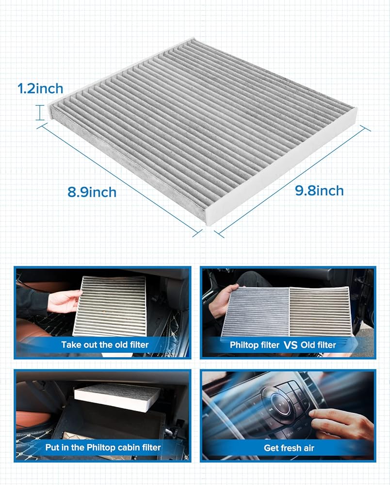 Enjoy Fresh Air: PHILTOP ACF036 cabin air filter is made of three high-efficiency filter materials: long fiber electrostatic cloth, activated carbon, and acrylic resin coated filter paper, which can filter up 99% of dust, pollen, and other contaminants in the air, provide a comfortable car environment for you and your family