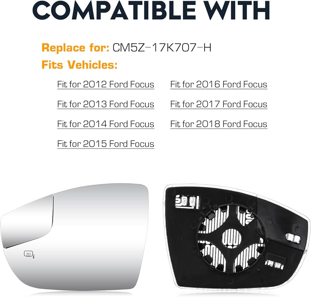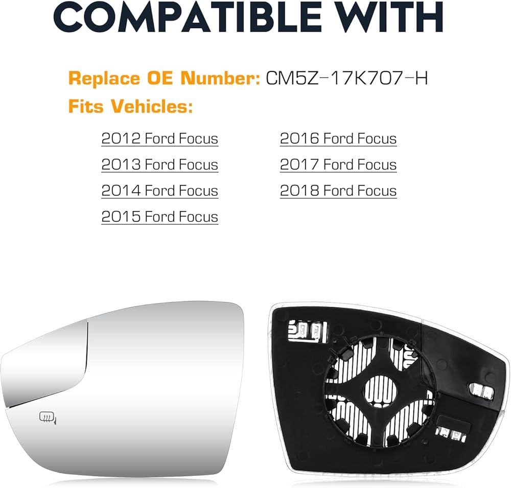 Compatible with: This left side heated mirror glass fit for Ford Focus 2012 2013 2014 2015 2016 2017 2018 side view mirror glass. Please kindly check the fitment and part number to ensure this will fit your model before ordering.(Without Auto-Dimming, without Bling Spot Detection Function.)