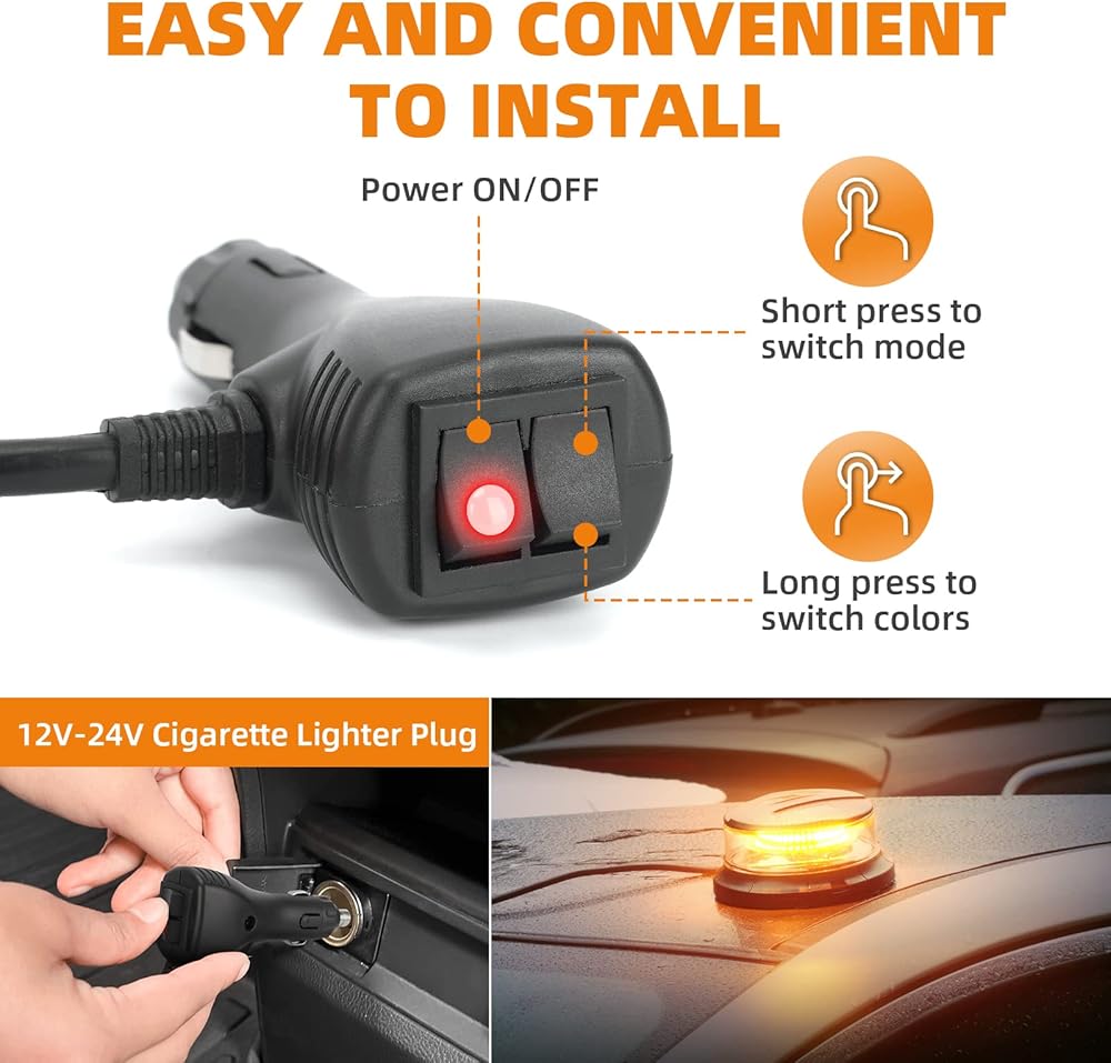 EASY TO USE-The Warning Safety Flashing Beacon Lights design with a 9.2FT power cable & 2 switch buttons, directly plug to car cigarette lighter then press the button for turning ON/OFF or changing the flashing light patterns.