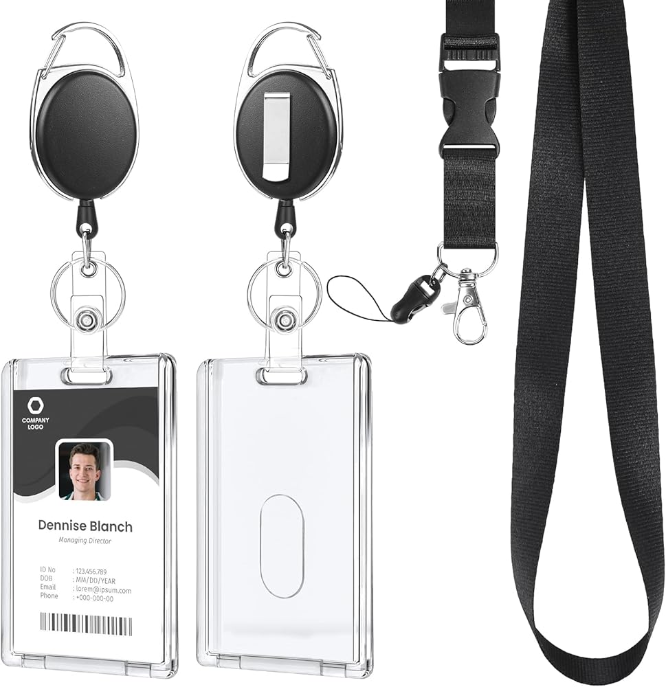 What You Get: 1 pcs retractable keychain with carabiner, 1 pcs badge reels with breakaway lanyard, and 1 pcs transparent badge holder with thumb slot.