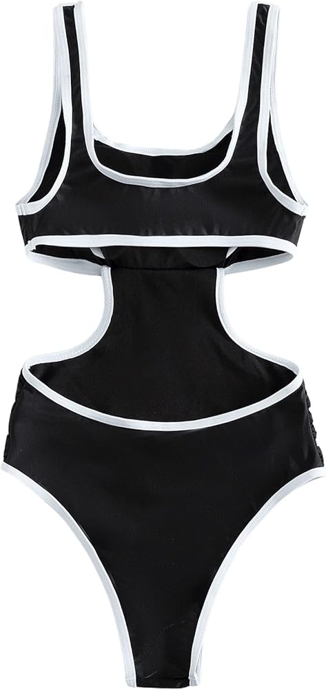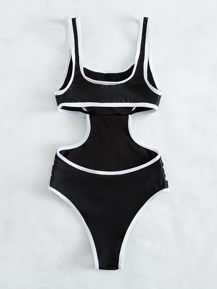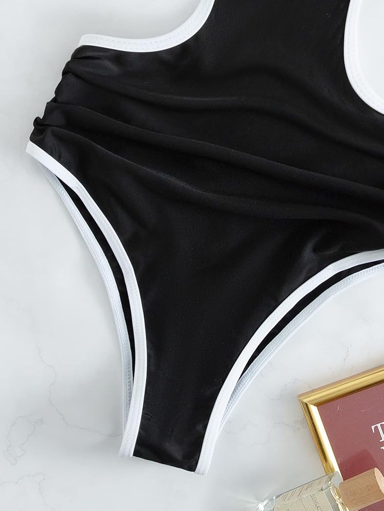 Floerns Women's Cut Out Back Bathing Suit Contrast Binding Scoop Neck Ruched Monokini Swimsuit