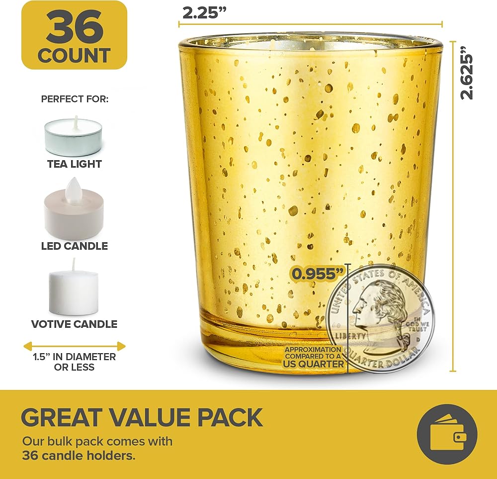 Great Value: Our large votive candle holders bulk pack includes 36 gold centerpiece candle holders, each 2 1/4"DIA x 2 5/8"H. Designed to hold any tealight, tall or short, white, black or gold candles, or any candles measuring 1.5"DIA or less.