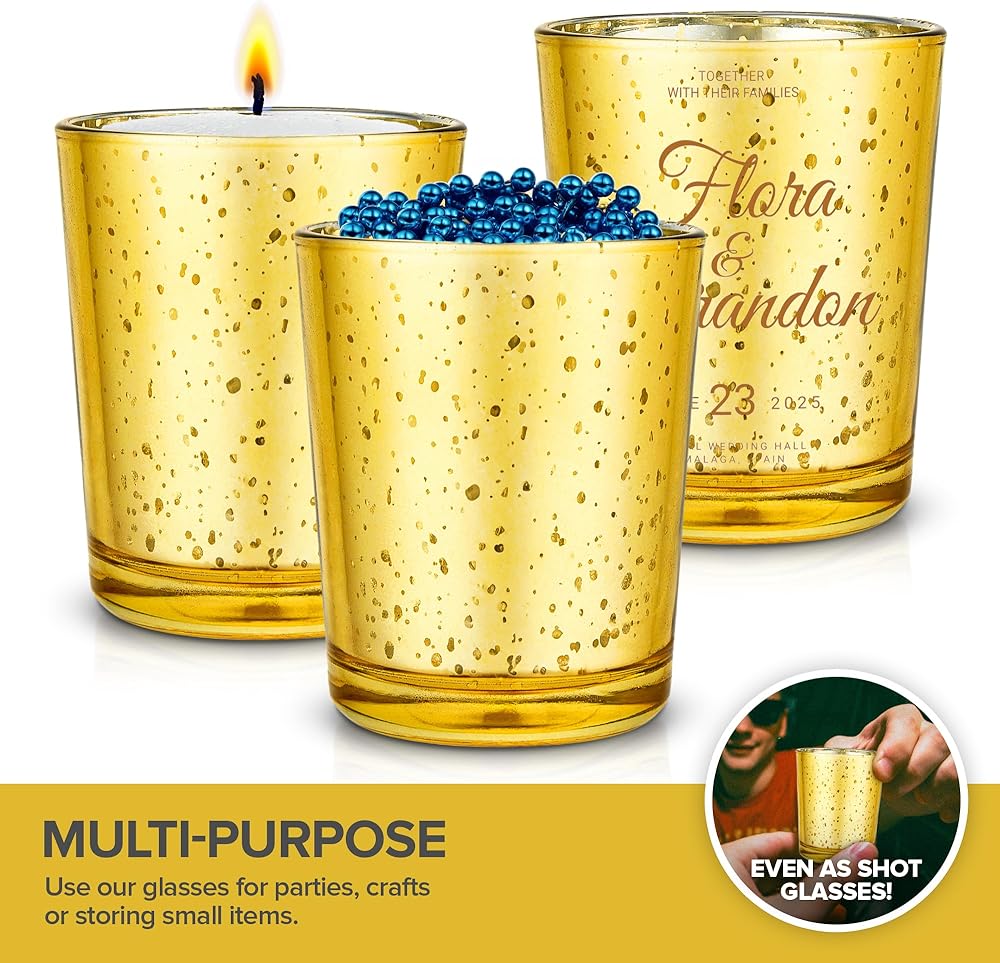 Multi-Purpose: Our valentine votive candle holders offer versatility--whether you need party decorations or wedding table center pieces, our gold mercury glass votives also come in handy for crafting, storing small items, or even as fancy shot cups!