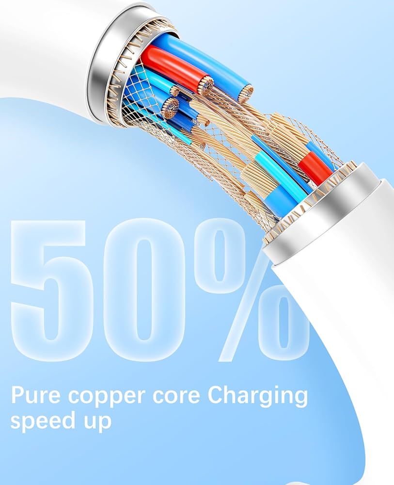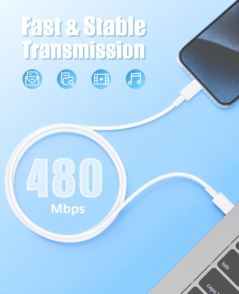 [iPhone 15 Fast Charger Cord] Charging your iPhone 15 Series fron 0% to 50% in just 30 mins, delivers a high-speed charge up to 3A (60W), you need a USB-C port wall charger to match it. (including Apple 18W, 20W, 29W, 30W, 61W, or 87W USB-C Power Adapter), 3X faster than regularly usb cables. It also supports data transfer speeds of up to 480Mbps to easily transfer music, photos and files between iPhone and Macbook in seconds.