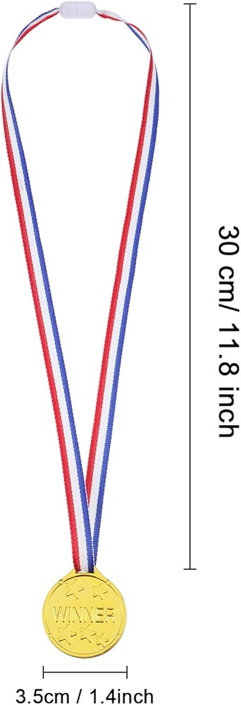Material: the winner medals are made of plastic, rope is made of ribbon; ribbon color is red, white and blue; Winner medals diameter is 3.5 cm/ 1.4 inch, ribbon length is 30 cm/ 11.8 inch