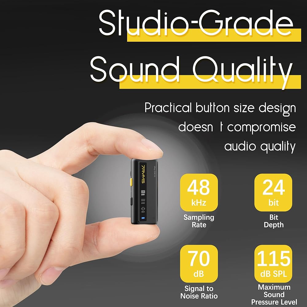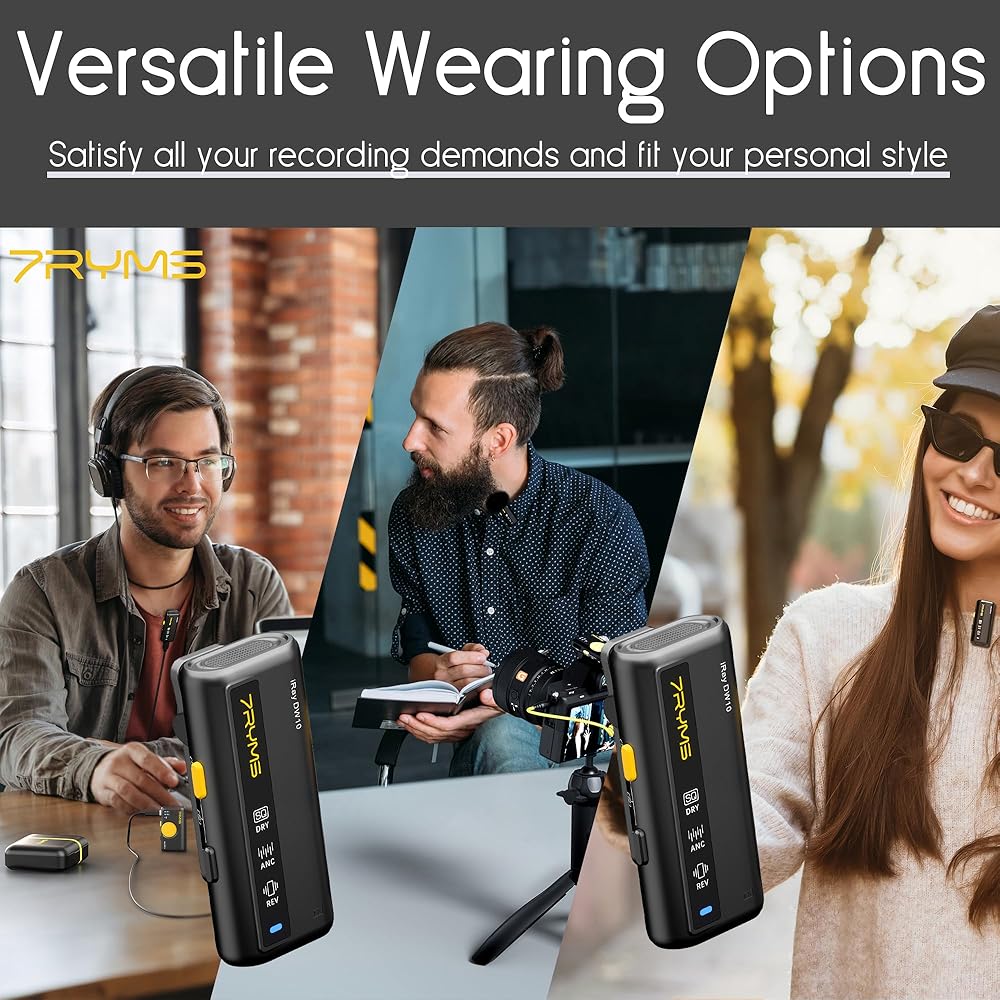 < DRY/ANC/REV Noise Cancellation>One-Click Noise Cancellation: The 7RYMS DW10 features a cutting-edge DSP noise cancellation chip, which provides effective environmental noise cancellation, making your video voice clear and clean. The Wireless lapel microphone maintains high recording standards with a 48kHz/24bit depth and a 70dB signal-to-noise ratio, ensuring excellent audio signals with minimal background noise.