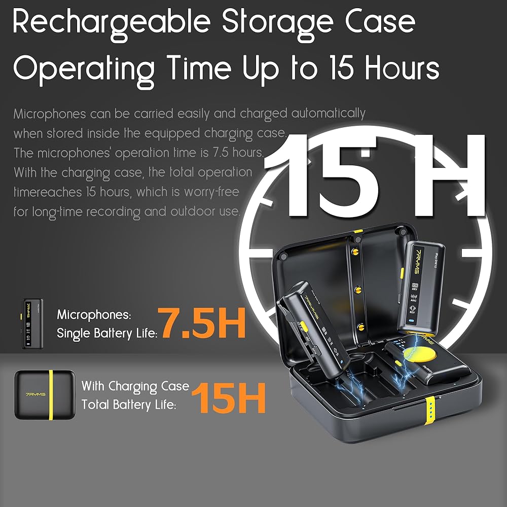 <Lightweight and Compact charging case>7RYMS DW10 wireless lavalier microphone weighs only 0.40oz/11g and measures TX: 1.92X0.86X0.62 and RX: 1.92X1.14X0.72inch, providing a comfortable wear experience. It offers 15 hours of continuous working time when fully charged. The compact charging case can fully charge the entire set twice, eliminating worries about low battery situations