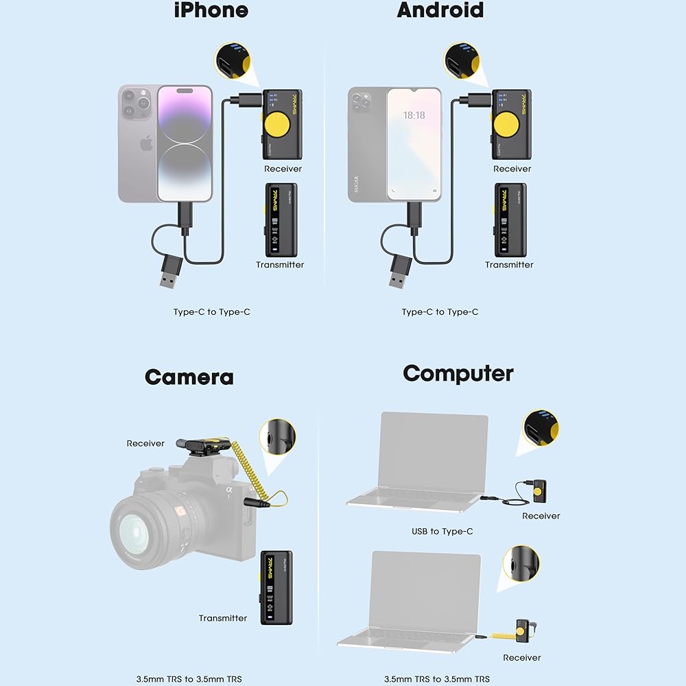 <Widely Compatible>7RYMS DW10 wireless lav mic is widely compatible with iPhone 15 Pro Max Plus and Android phones. It also includes a USB A to Type C data cable for PC and MAC computer transmission, as well as a camera audio cable for connecting to DSLR cameras using a 3.5mm TRRS cable. Truly plug and play, it enables faster work for live streaming, weddings, office meetings, conferences, outdoor shooting, and news interviews.