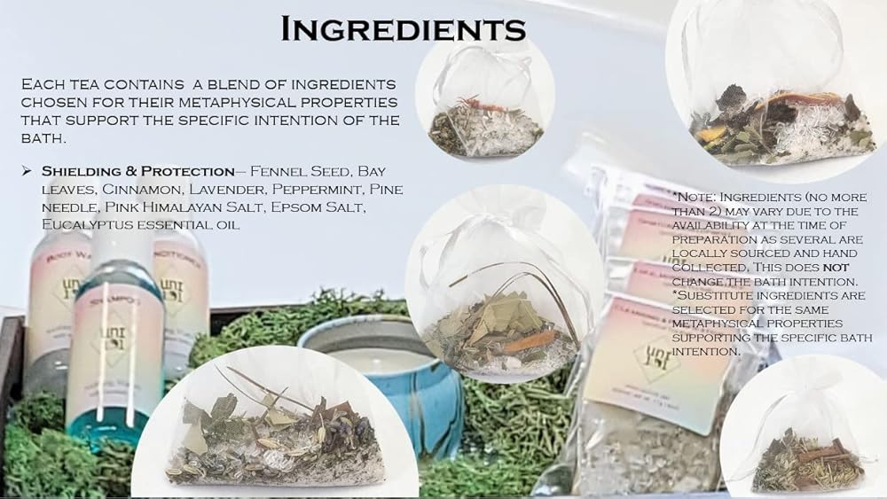 Ingredients* may occasionally vary (no more than 2) for the same type of Spiritual Tea Bath. This variation is due to hand-collection of certain ingredients which means it may be unavailable at the time a specific product was made. The variation in ingredients does not change the intention (goal/purpose) of the bath. All Spiritual Tea Baths contain the same number of ingredients.