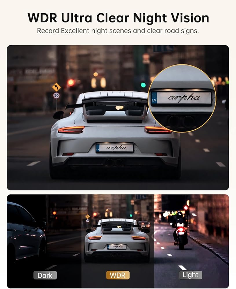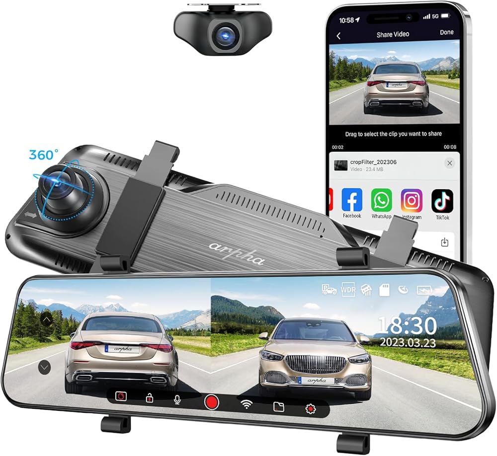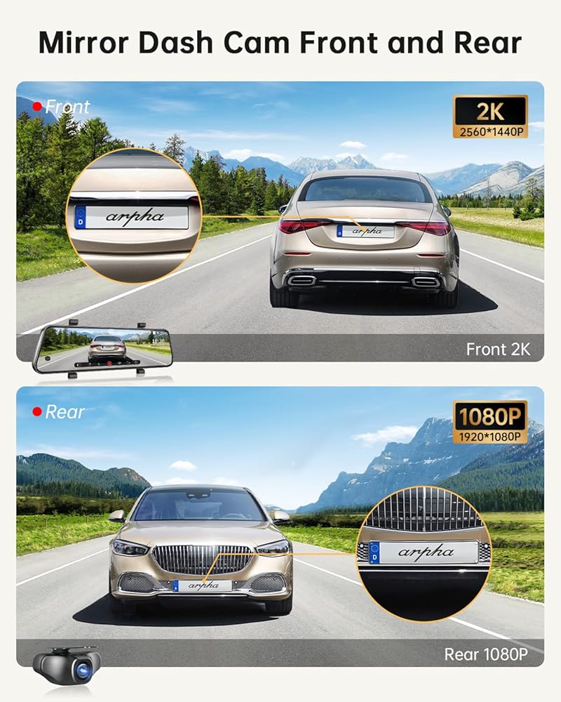 Dual Mirror Dash Cam Resolution: Arpha E22 Dual Rear View Dash Cam: 1. Front: 2K; 2. Front and rear: 2K+1080P. Ensuring that license plates, road signs, and any other critical details are accurately captured.