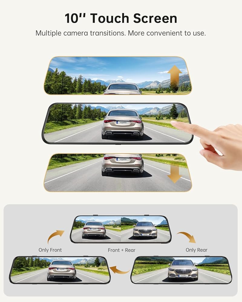 10 Inch Touch Screen Dashcam: Rear view mirror dash camera for cars offers 10 inch screen streaming media full touch screen. User could operate dashcam easily.