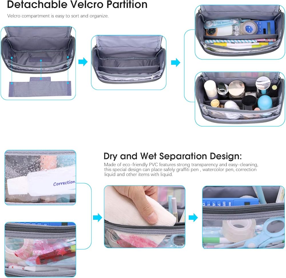 Unique Internal Design: The pencil case has a dry-wet separation portable bag for marker pen, graffiti pen, correction fluid and other liquid dirty substances, which is transparent for access, easy to wipe and clean.