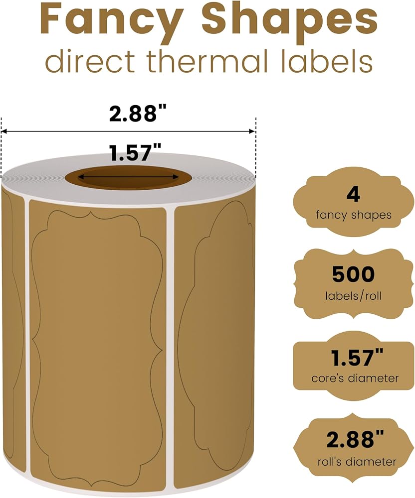SPECIFICATION - FATICO brown thermal label stickers roll include 500 labels and 4 fancy shapes. The diameter of each thermal label is 2.5"x1.5", and the core of thermal stickers roll is 1.57".