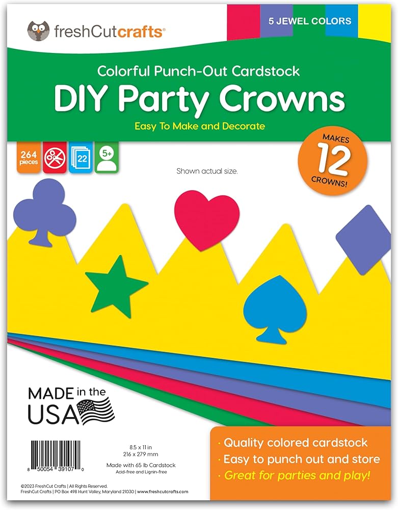 HIGH-QUALITY CARD STOCK – Pack includes 22 sheets of sturdy, high-quality US Made colored cardstock that holds 12 easy punch-out crown bases and 200+ decorative shapes in 5 saturated jewel tones—red, purple, blue, yellow, and green. Our products are NOT printed, NOT construction paper, NOT foam shapes!