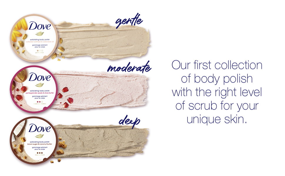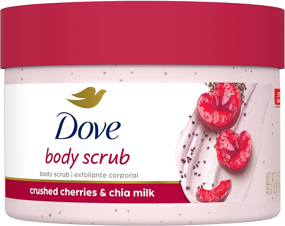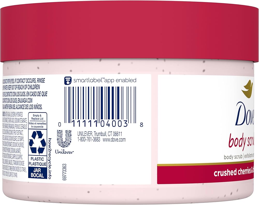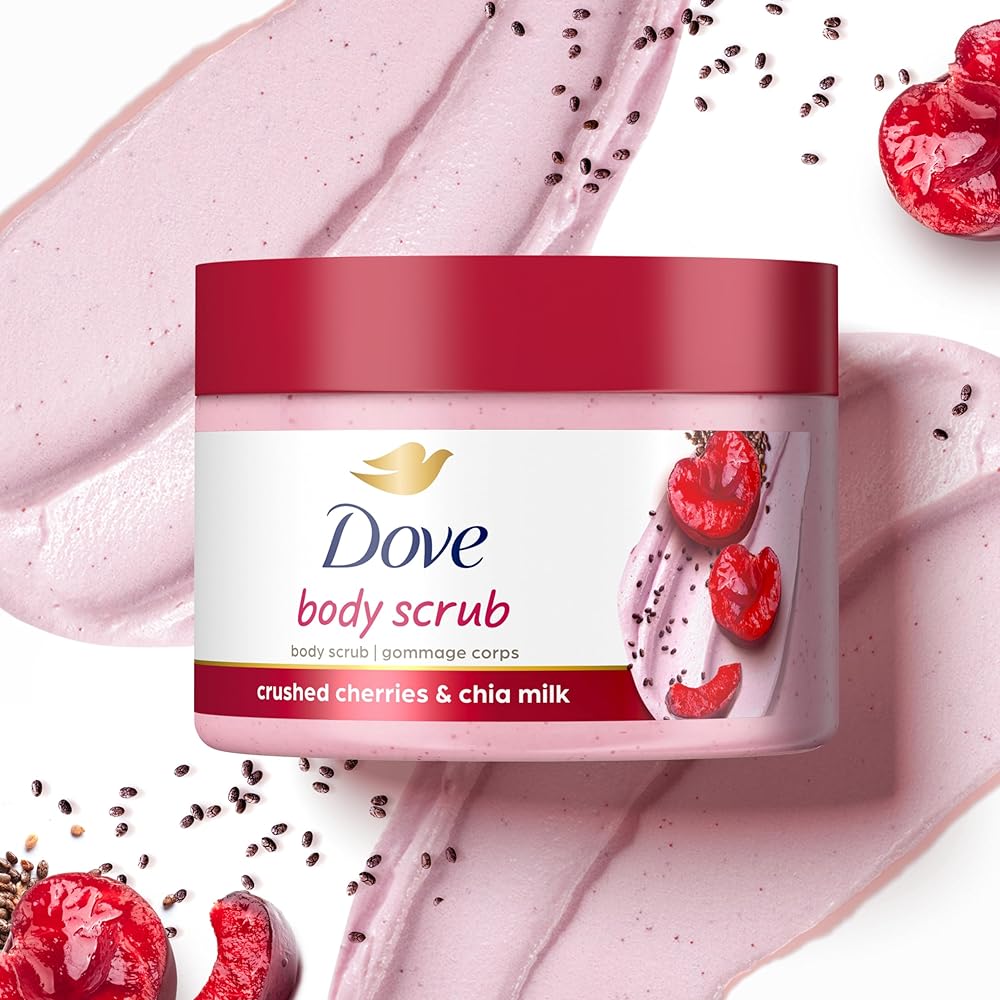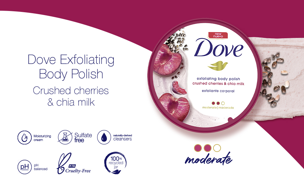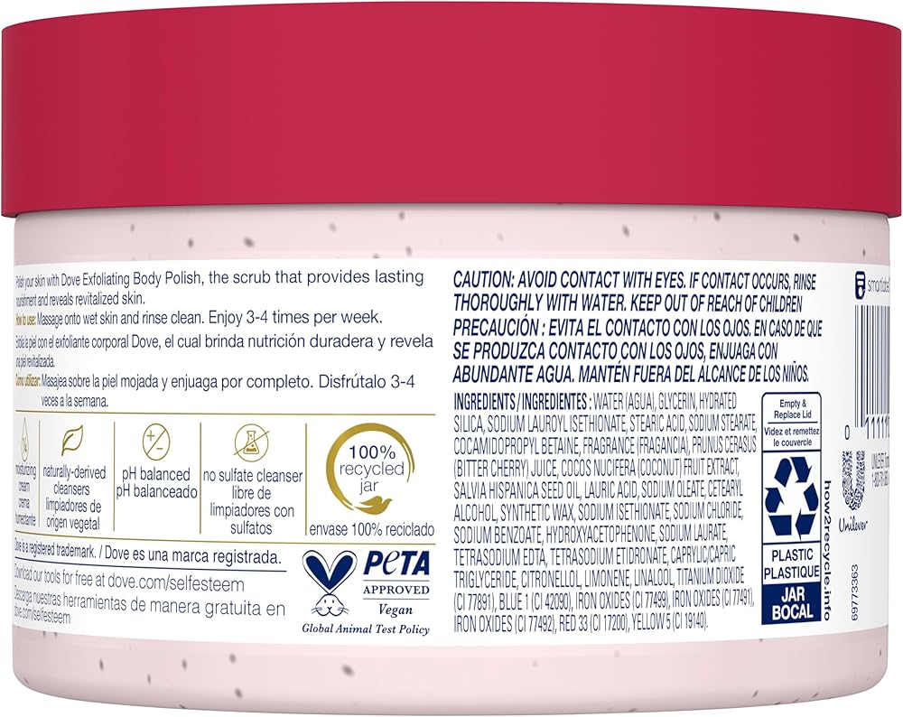 Revitalize your skin and senses with Dove Exfoliating Body Polish. This exfoliating body polish, with ¼ moisturizing cream, provides lasting nourishment to reveal revitalized skin. Infused with crushed cherries and chia milk, this body polish gently exfoliates, cleanses, and nourishes your skin and provides complete skin care. How to use: Scoop a generous amount of Dove Body Polish into your palms. Enjoy 3-4 times per week. At Dove, our vision is of a world where beauty is a source of confidence, and not anxiety. We are on a mission to help the next generation of women develop a positive relationship with the way they look—reaching over ¼ of a billion young people with self-esteem education by 2030. We are also committed to a landmark new initiative as part of our 2025 commitment to reduce plastic waste; reducing over 20,500 metric tons of virgin plastic annually by making the iconic beauty bar packaging plastic-free globally; launching new 100% recycled plastic bottles; and trialing a new refillable deodorant format that radically reduces plastic use. As one of the largest beauty brands in the world, we are revealing an agenda-setting commitment to tackle the global beauty industry's plastic waste issue.