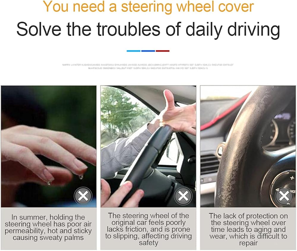 【Full Protection】: A durable steering wheel cover is the number one choice for covering an old or worn out original steering wheel. It protects your steering wheel from sunburn, scratches, fading, wear and dirt. It also has a very nice soft touch that protects your hands from heat and cold, keeps you warm in winter and cool in summer and absorbs sweat.