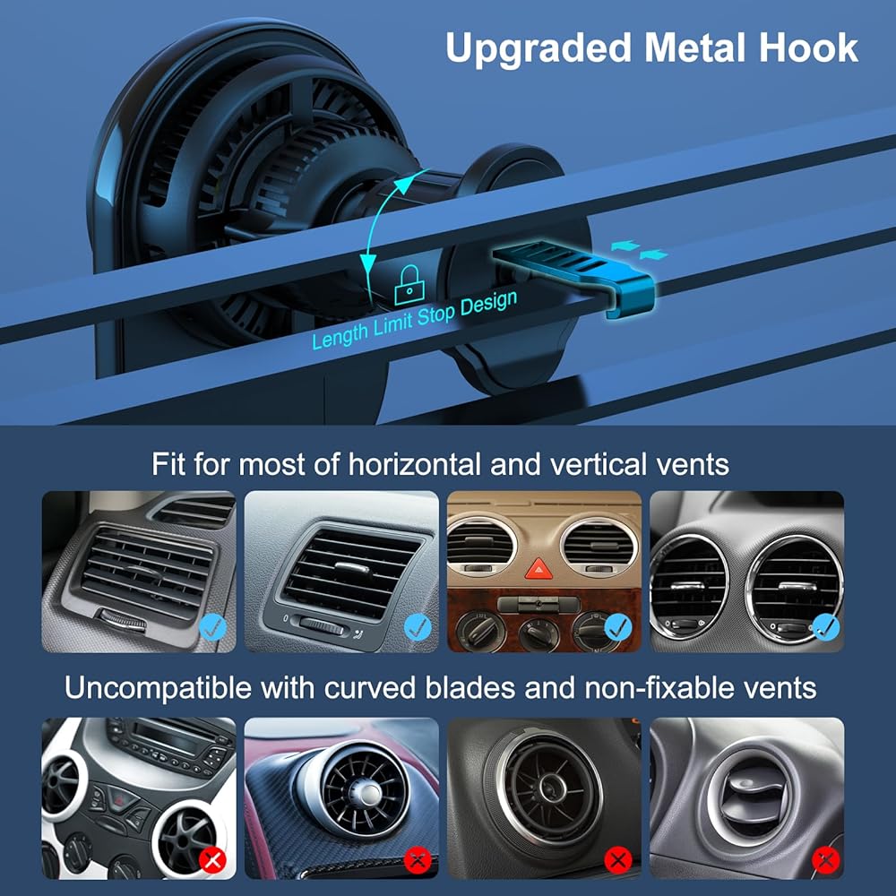 【Upgraded Anti-Shake Air Vent Clip】The mag safe car mount adopts an upgraded air vent clip to provide stronger support, allowing your iPhone to be firmly fixed on the air vent without falling off. You can adjust the tightness of the telescoping hook to lock the power exhaust blade. Also, it fits most car vents, including round, horizontal and vertical vents, not for swivel vents.