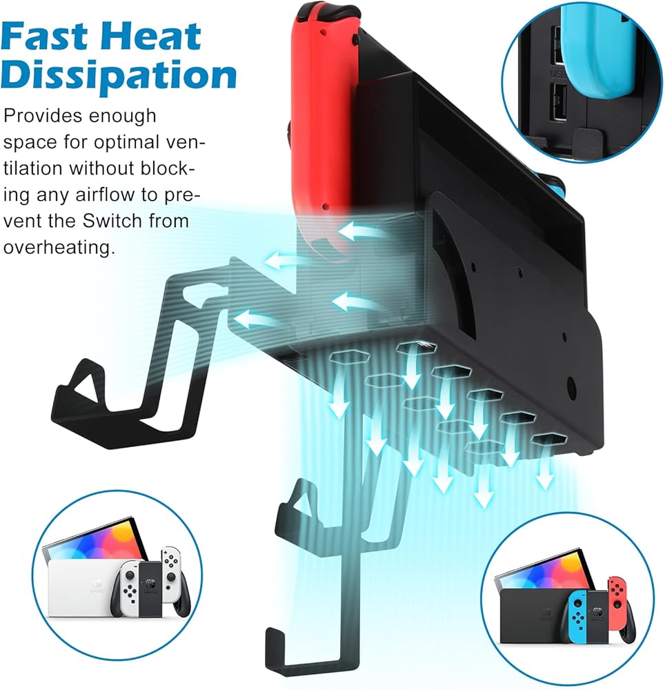 【Heat Dissipation & Detachable Design】This Switch metal wall mount kit features geometric heat dissipation holes at the bottom to ensure maximum airflow and to keep your beloved Switch cool and chill. 2 controller brackets and headphone hanger can be freely assembled or detached.
