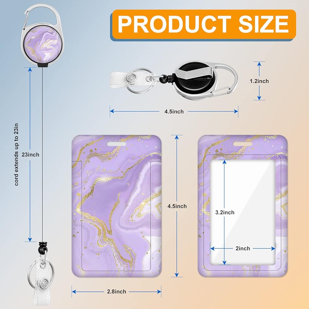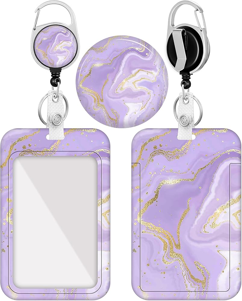 Plifal Badge Holder with Retractable Reel, Trendy Marble Print ID Name Tag Work Badge Clip Heavy Duty Vertical Card Protector Cover Case for Work Office Nurse Medical Student Teacher Women(Purple)
