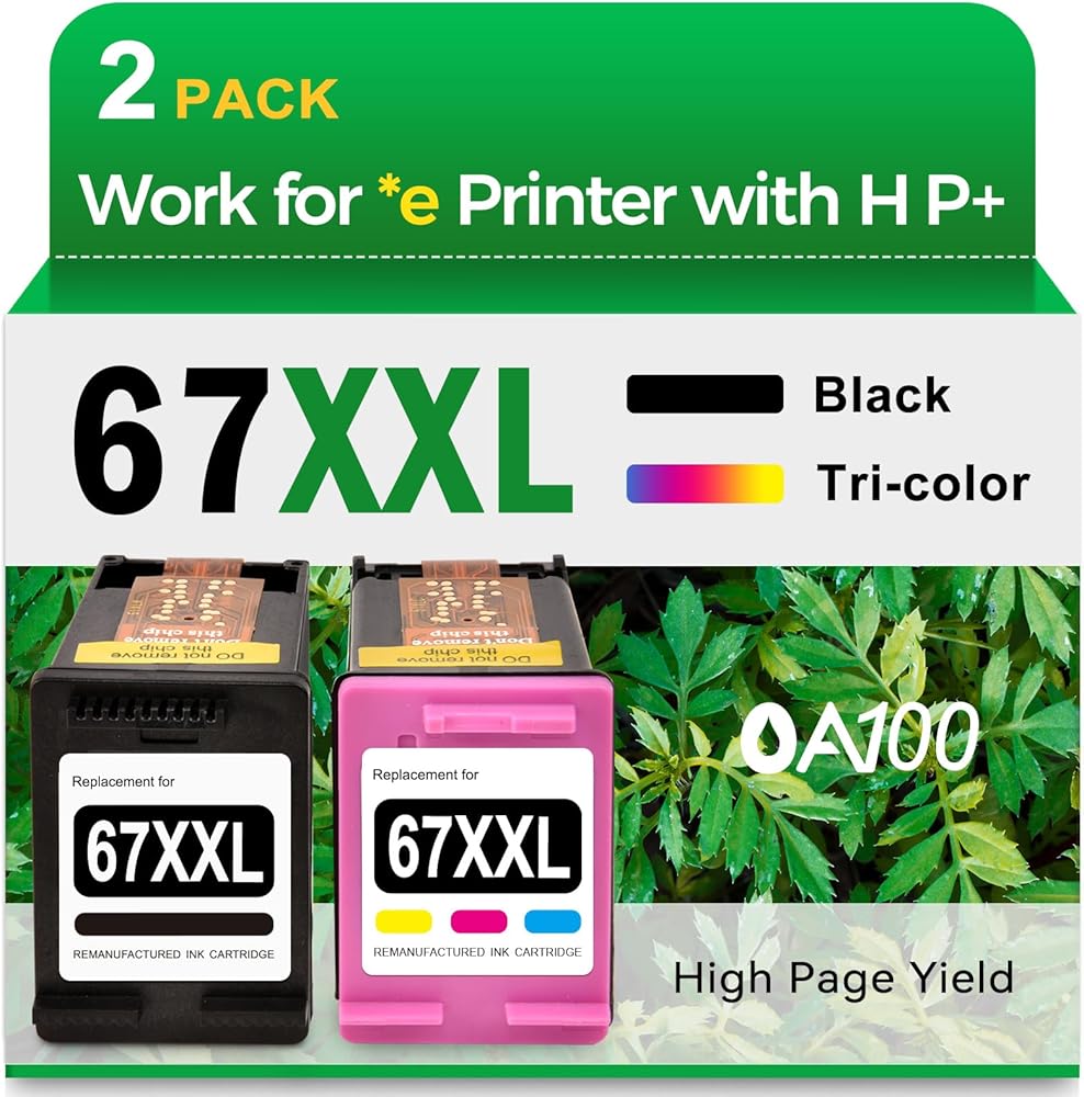 67XXL Package Including: 2 pack of remanufactured 67xxl ink cartridges for HP printer ink 67, with up-to-date chips to compatible with *e series printer with HP+