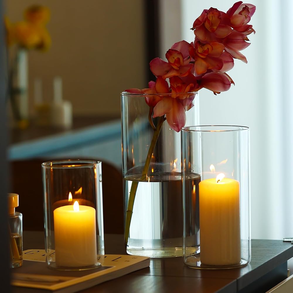 GLASS VASE 3 PCS: The cylinder vase set contains 3 pack clear candle vases , the height is about 6,8,10 inch, Simple and versatile collection of glass vases. These are good for either candles or flowers. The sizes are well thought out for the most common uses
