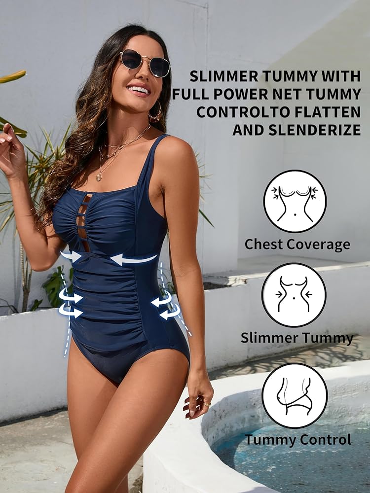 [Classic Design] The one piece swimsuit women with modest pattern, enough fabric to wrap the side breast ,hollow and ruched front create sexy and flattering figure.Good coverage on bottom to advoid ride up,keep everything in place . This bathing suit for women with fixed soft cups that gives you maximum freedom.