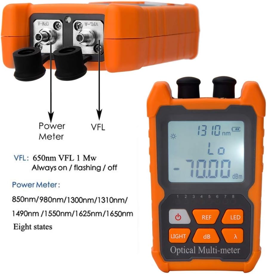 Function: can measure 8 standdard wavelengths 850/980/1300/1310/1490/ 1550/1625/1650nm , test range: -70dBm~+6dBm, 2mw red light source.