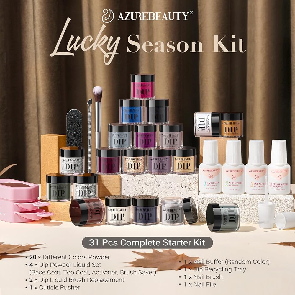 【2022 New Upgrade Kit】: The new upgrade dipping powder kit is more in line with everything beginners need, the 31-Pcs dip powder kit includes: 20*0.33oz nail dip powder colors, 4*0.34oz dip powder liquid set (base coat/activator/topcoat/brush saver), 1*nail brush, 1*nail file, 2*powder liquid brush replacement, 1*cuticle pusher, and the newly added 1*Dip Powder Recycling System, 1*nail polishing block, AZUREBEAUTY home dip powder nail kit can get nail art salon-quality equipment for a small fee.