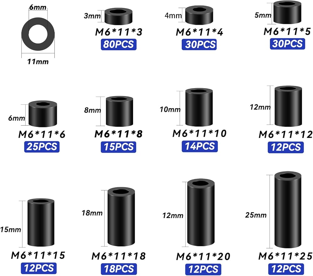 【16 Sizes】M3-OD 7mm, ID 3mm;M4-OD 7mm,9mm,ID 4mm.90 pieces 3x7x1;50 pieces 3x7x3; 30pieces 3x7x5; 40 pieces 3x7x6; 30 pieces 3x7x8; 30 pieces 3x7x10; 10 pieces 3x7x12; 20 pieces 3x7x15; 90 pieces 4x9x1; 50 pieces 4x7x3; 30 Pieces 4x7x5; 40 pieces 4x7x6;30 pieces 4x7x8; 30 pieces 4x7x10; 10 pieces 4x7x12; 20 pieces 4x7x15. A total of 600 pieces, suitable for most screws.
