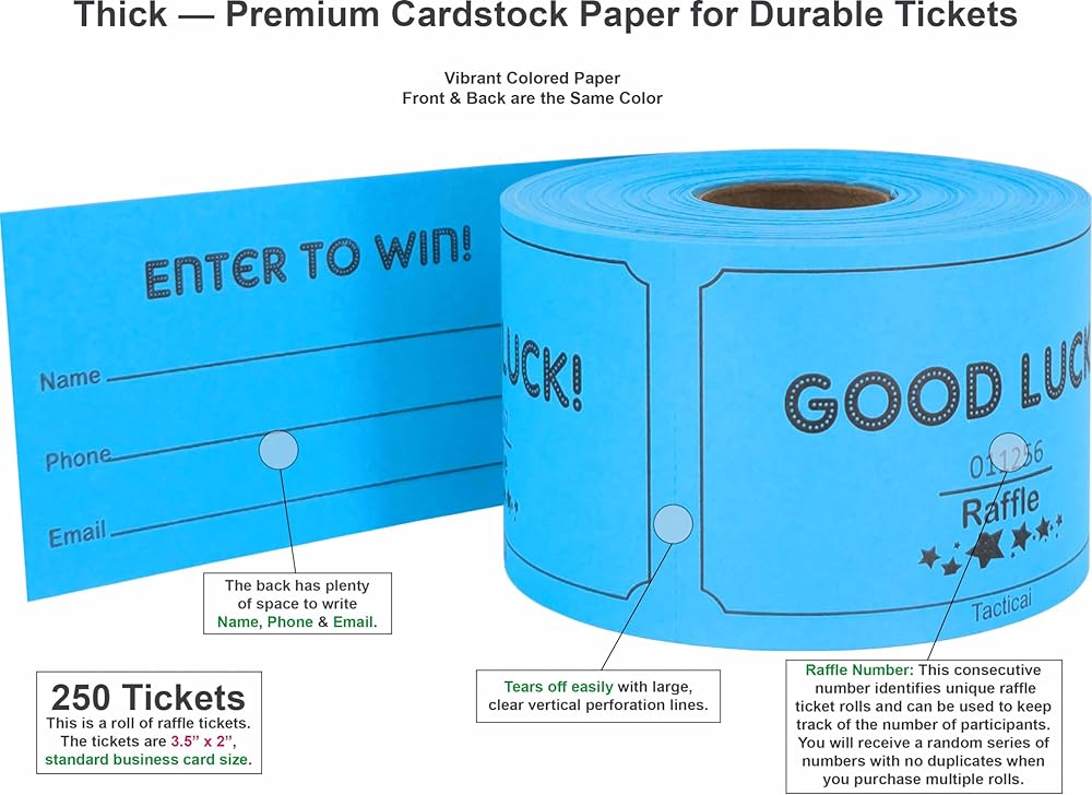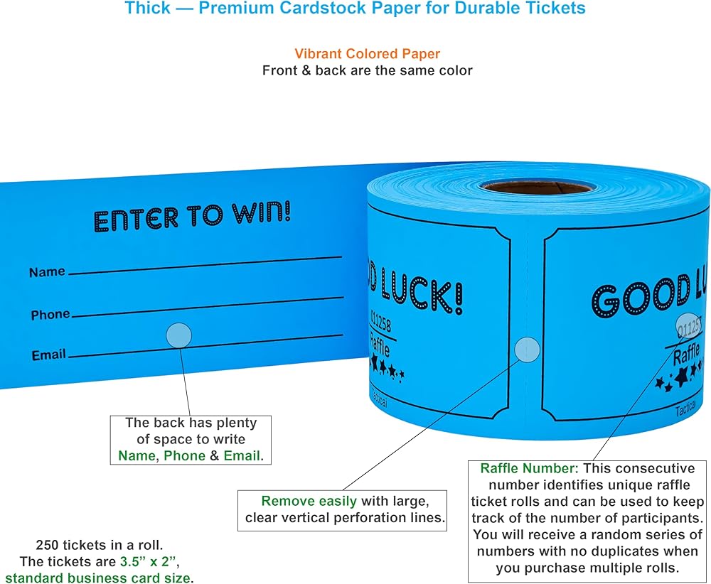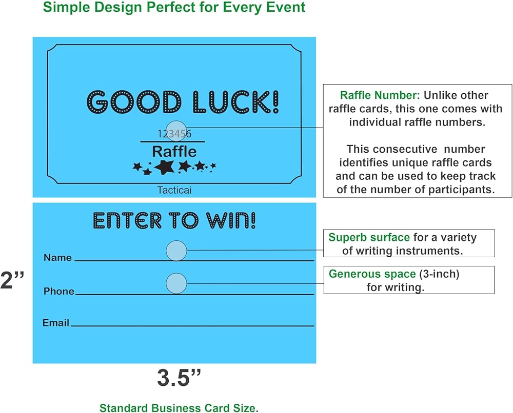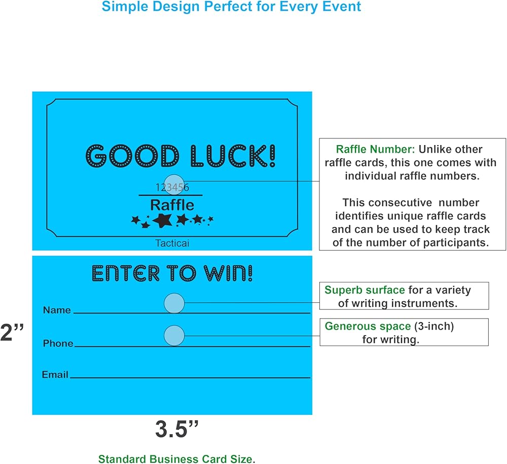 RAFFLE OPTIONS – Each pack contains 250 raffle cards that can support small, medium, and large events. Easy to write for collection of name, phone number and email address. Each ticket is 3.5” x 2”.