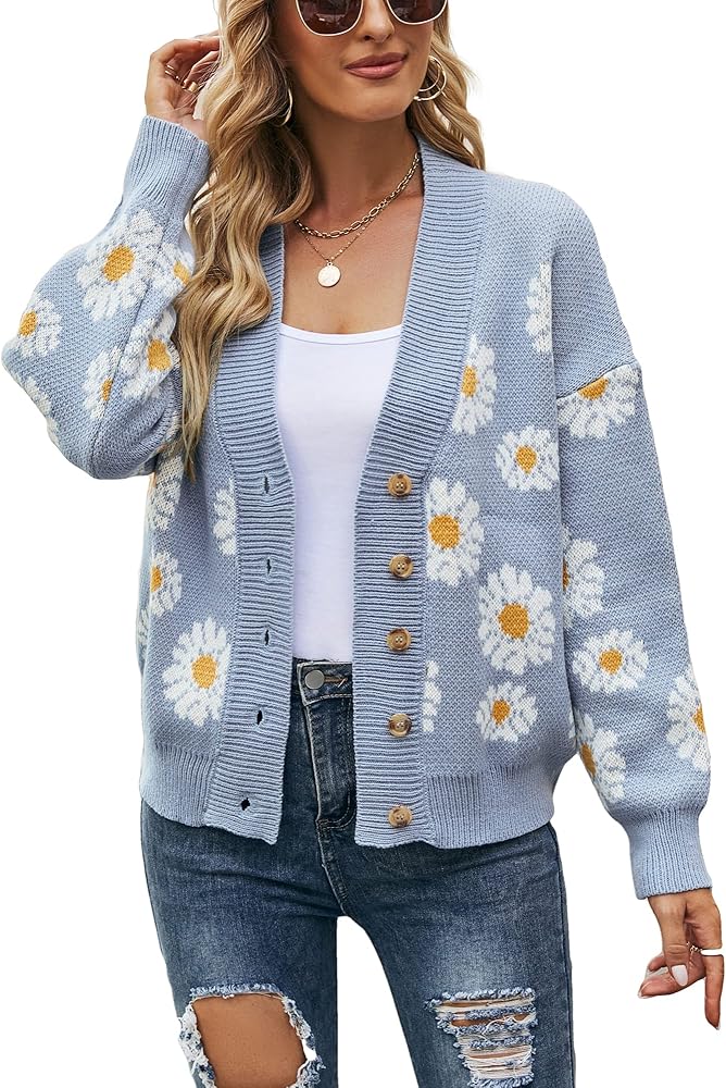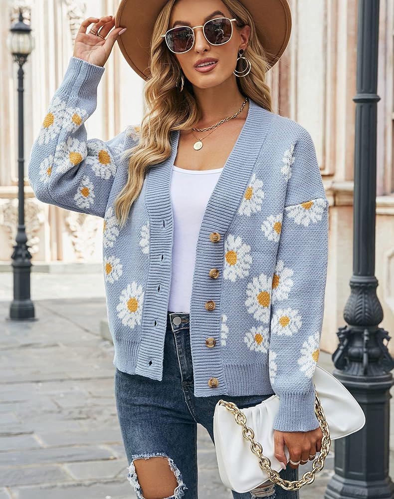 Features: Stylish floral print, V neck, Long sleeves, Drop shoulder sleeves, Button front, Wide front placket, Knitted cardigan sweater, Vintage casual style