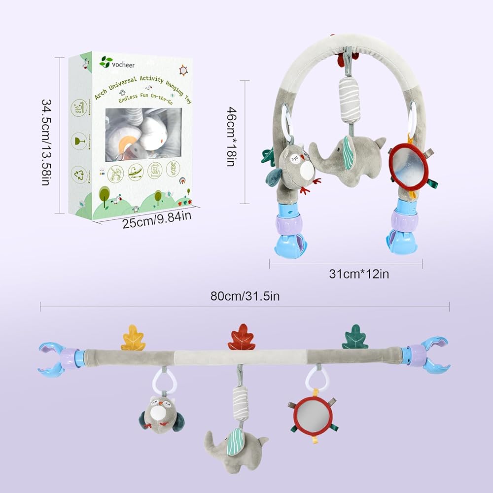 Sensory and Motor Skill Development: the plush toys of Baby Stroller Arch Toy made by super soft fabric and built-in squeaker, which can attract baby's intention to feel and grab, meanwhile these toys can provides the visual stimulation and inspire the baby's focus while starring at the moving soft toys