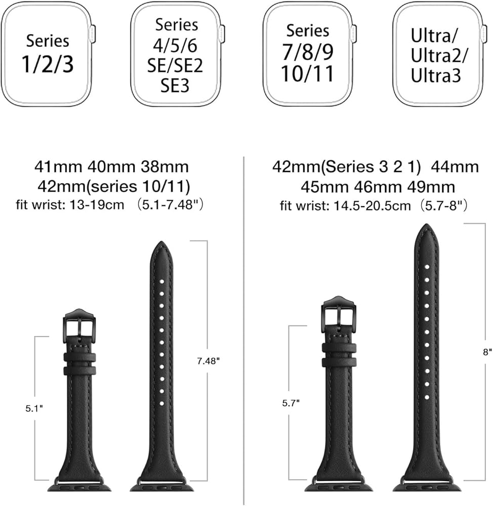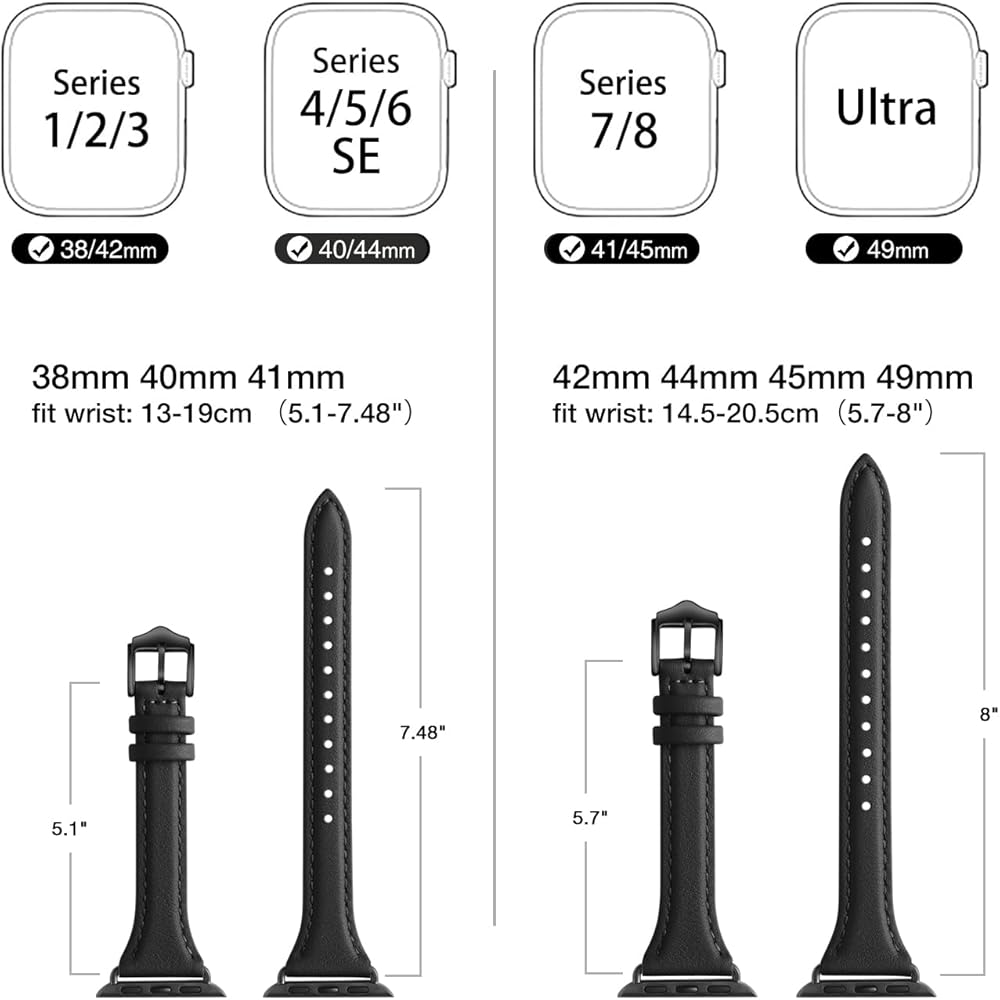[Compatible model and size] Compatible with Apple watch SE & Series 9, 8, 7, 6, 5, 4, 3, 2, 1 38mm, 40mm, 41mm. Multiple holes can adjust a width of 5.3"-7.7"(130mm-195mm) , whether you have a small wrist or a large wrist, it can fit perfectly